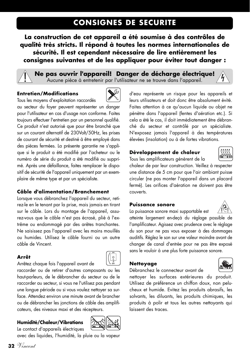 incidence sur le son. Posez l'appareil uniquement sur une surface appropriée et stable. Pour profiter pleinement du potentiel sonore de votre système, nous vous recommandons de placer les appareils sur des racks Vincent et de ne pas les poser l'un sur l'autre.