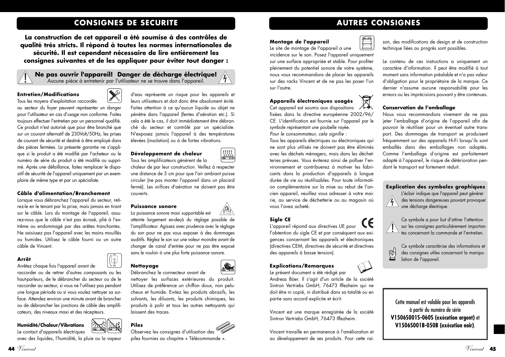 Voutrouvrez à la fin de ce manuel un petit glossaire qui vous explique les termes techniques utilisés. Notre revendeur est à votre disposition pour répondre à vos questions. Il est aussi votre interlocuteur en cas de recours à la garantie ou pour les réparations après la période de garantie. Dans tous les cas, vos expériences avec les produits Vincent l'intéressent, n'hésitez pas à lui en faire part.