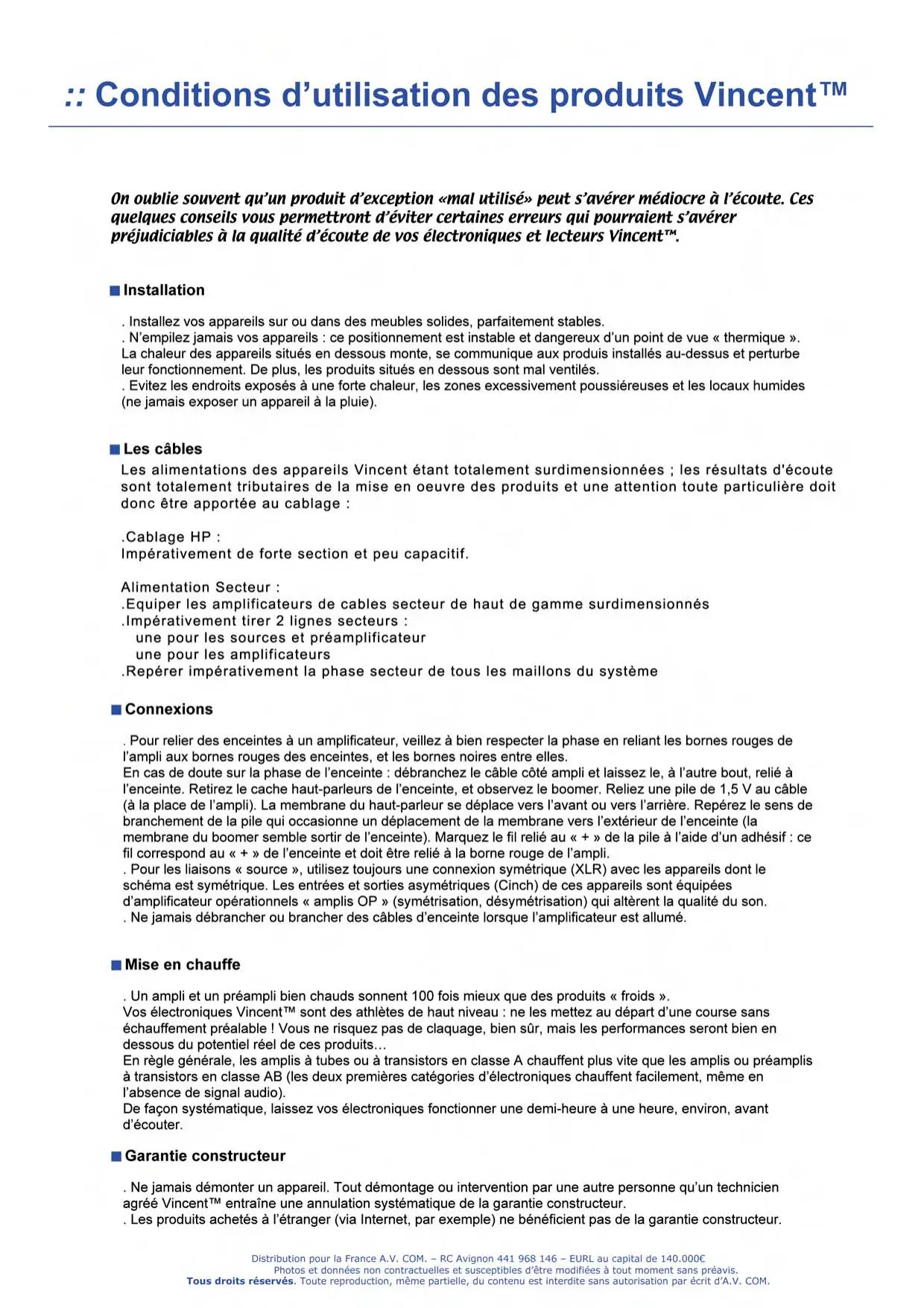 :: Conditions d'utilisation des produits Vincent" On oublie souvent qu’un produit d’exception «mal utilisé» peut s’avérer médiocre à l’écoute. Ces quelques conseils vous permettront d'éviter certaines erreurs qui pourraient s'avérer préjudiciables à la qualité d'écoute de vos électroniques et lecteurs Vincent"“. minstallation . Installez vos appareils sur ou dans des meubles solides, parfaitement stables. . N'empilez jamais vos appareils : ce positionnement est instable et dangereux d'un point de vue « thermique ». La chaleur des appareils situés en dessous monte, se communique aux produis installés au-dessus et perturbe leur fonctionnement. De plus, les produits situés en dessous sont mal ventilés. . Evitez les endroits exposés à une forte chaleur, les zones excessivement poussiéreuses et les locaux humides (ne jamais exposer un appareil à la pluie). mLes câbles Les alimentations des appareils Vincent étant totalement surdimensionnées ; les résultats d'écoute sont totalement tributaires de la mise en oeuvre des produits et une attention toute particulière doit donc être apportée au cablage : .Cablage HP : Impérativement de forte section et peu capacitif. Alimentation Secteur : .Equiper les amplificateurs de cables secteur de haut de gamme surdimensionnés .Impérativement tirer 2 lignes secteurs : une pour les sources et préamplificateur une pour les amplificateurs .Repérer impérativement la phase secteur de tous les maillons du système m Connexions . Pour relier des enceintes à un amplificateur, veillez à bien respecter la phase en reliant les bornes rouges de l'ampli aux bornes rouges des enceintes, et les bornes noires entre elles. En cas de doute sur la phase de l'enceinte : débranchez le câble côté ampli et laissez le, à l'autre bout, relié à l'enceinte. Retirez le cache haut-parleurs de l'enceinte, et observez le boomer. Reliez une pile de 1,5 V au câble (à la place de l'ampli). La membrane du haut-parleur se déplace vers l'avant ou vers l'arrière. Repérez le sens de branchement de la pile qui occasionne un déplacement de la membrane vers l'extérieur de l'enceinte (la membrane du boomer semble sortir de l'enceinte). Marquez le fil relié au « + » de la pile à l'aide d'un adhésif : ce fil correspond au « + » de l'enceinte et doit être relié à la borne rouge de l'ampli. . Pour les liaisons « source », utilisez toujours une connexion symétrique (XLR) avec les appareils dont le schéma est symétrique. Les entrées et sorties asymétriques (Cinch) de ces appareils sont équipées d'amplificateur opérationnels « amplis OP » (symétrisation, désymétrisation) qui altèrent la qualité du son. Ne jamais débrancher ou brancher des câbles d'enceinte lorsque l'amplificateur est allumé. m Mise en chauffe . Un ampli et un préampli bien chauds sonnent 100 fois mieux que des produits « froids ». Vos électroniques Vincent" sont des athlètes de haut niveau : ne les mettez au départ d'une course sans échauffement préalable ! Vous ne risquez pas de claquage, bien sûr, mais les performances seront bien en dessous du potentiel réel de ces produits. En règle générale, les amplis à tubes ou à transistors en classe A chauffent plus vite que les amplis ou préamplis à transistors en classe AB (les deux premières catégories d'électroniques chauffent facilement, même en l'absence de signal audio). De façon systématique, laissez vos électroniques fonctionner une demi-heure à une heure, environ, avant d'écouter. & Garantie constructeur . Ne jamais démonter un appareil. Tout démontage ou intervention par une autre personne qu'un technicien agréé Vincent" entraîne une annulation systématique de la garantie constructeur. . Les produits achetés à l'étranger (via Internet, par exemple) ne bénéficient pas de la garantie constructeur. Distribution pour la France A.V. COM. — RC Avignon 441 968 146 - EURL au capital de 140.000€ Photos et données non contractuelles et susceptibles d'être modifiées à tout moment sans préavis. Tous droits réservés. Toute reproduction, même partielle, du contenu est interdite sans autorisation par écrit d'A.V. COM