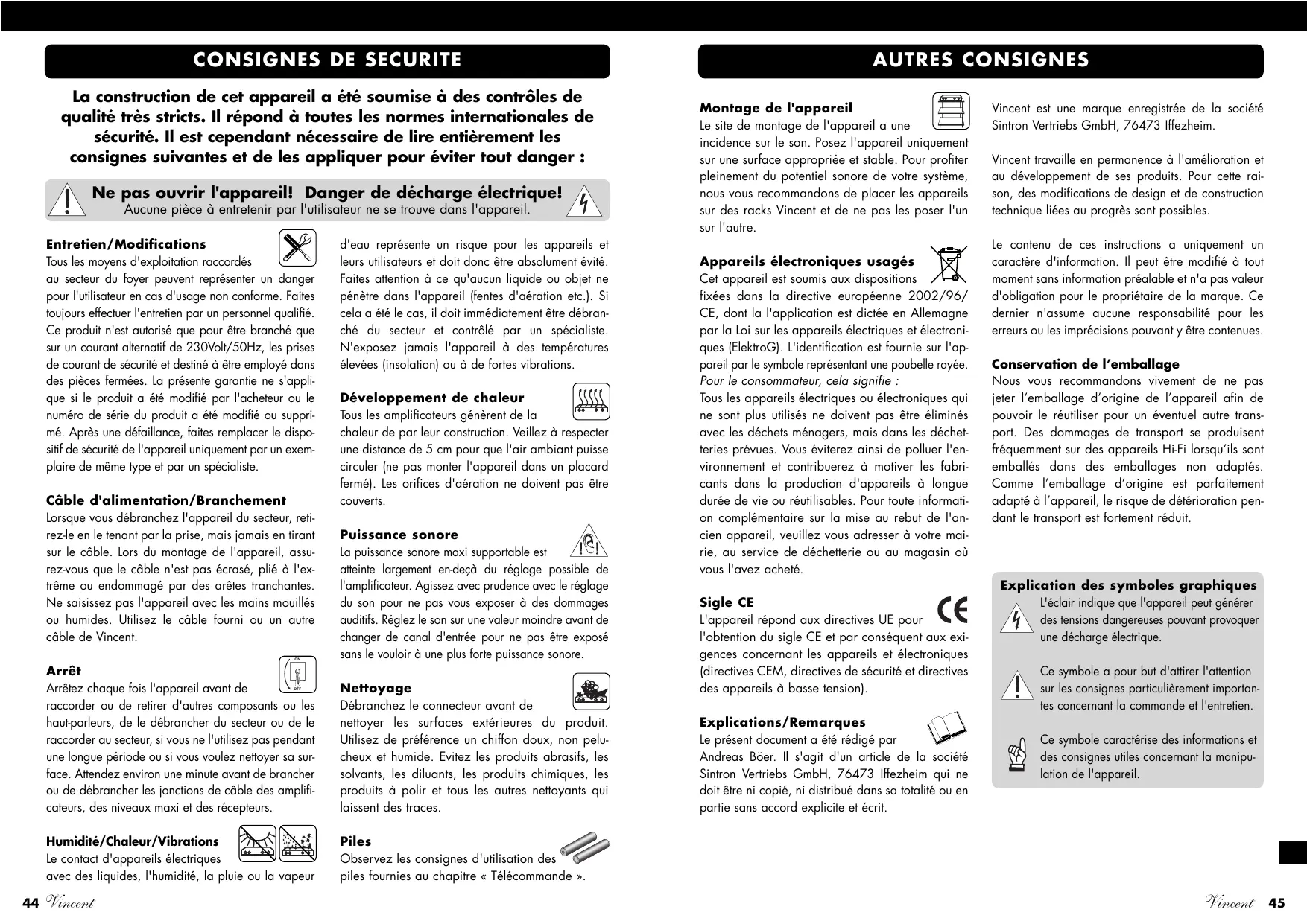 La construction de cet appareil a été soumise à des contrôles de qualité très st sécurité. Il est cependant nécessaire de li ts. Il répond à toutes les normes internationales de entièrement les consignes suivantes et de les appliquer pour éviter tout danger : Entretien/Modifications Tous les moyens d'exploitation raccordés au secteur du foyer peuvent représenter un danger pour l'utilisateur en cas d'usage non conforme. Faites toujours effectuer l'entretien par un personnel qualifié. Ce produit n'est autorisé que pour être branché que sur un courant alternatif de 230Volt/5OHz, les prises de courant de sécurité et destiné à être employé dans des pièces fermées. La présente garantie ne s'appli- que si le produit a été modifié par l'acheteur ou le numéro de série du produit a été modifié ou suppri- mé. Après une défaillance, faites remplacer le dispo- sitif de sécurité de l'appareil uniquement par un exem- plaire de même type et par un spécialiste. Câble d'alimentation/Branchement Lorsque vous débranchez l'appareil du secteur, reti- rez-le en le tenant par la prise, mais jamais en tirant sur le câble. Lors du montage de l'appareil, assu- rezvous que le câble n'est pas écrasé, plié à l'ex- trême ou endommagé par des arêtes tranchantes. Ne saisissez pas l'appareil avec les mains mouillés ou humides. Utilisez le câble fourni ou un autre câble de Vincent. Arrêt Arrêtez chaque fois l'appareil avant de raccorder ou de retirer d'autres composants ou les hautparleurs, de le débrancher du secteur ou de le raccorder au secteur, si vous ne l'utilisez pas pendant une longue période ou si vous voulez neftoyer sa sur- face. Attendez environ une minute avant de brancher ou de débrancher les jonctions de câble des amplif- cateurs, des niveaux maxi et des récepteurs. Humidité/Chaleur/Vibrations Le contact d'appareils électriques — avec des liquides, l'humidité, la pluie ou la vapeur 44 Vincent Ne pas ouvrir l'appareil! Danger de décharge électrique! Aucune pièce à entretenir par l'utilisateur ne se trouve dans l'appareil. d'eau représente un risque pour les appareils et leurs utilisateurs et doit donc être absolument évité. Faites attention à ce qu'aucun liquide ou objet ne pénètre dans l'appareil (fentes d'aération etc.). Si cela a été le cas, il doit immédiatement être débran- ché du secteur et contrôlé par un spécialiste. N'exposez jamais l'appareil à des températures élevées [insolation] ou à de fortes vibrations. Développement de chaleur Tous les amplificateurs génèrent de la chaleur de par leur construction. Veillez à respecter une distance de 5 cm pour que l'air ambiant puisse circuler {ne pas monter l'appareil dans un placard fermé). Les orifices d'aération ne doivent pas être couverts. Puissance sonore À\ La puissance sonore maxi supportable est /1EI\ aïteinte largement endecà du réglage possible de l'amplificateur. Agissez avec prudence avec le réglage du son pour ne pas vous exposer à des dommages auditifs. Réglez le son sur une valeur moindre avant de changer de canal d'entrée pour ne pas être exposé sans le vouloir à une plus forte puissance sonore Nettoyage Débranchez le connecteur avant de nettoyer les surfaces extérieures du produit Uïllisez de préférence un chiffon doux, non pelu- cheux et humide. Evitez les produits abrasifs, les solvants, les diluants, les produits chimiques, les produits à polir et tous les autres nettoyants qui laissent des traces. Piles 22 Observez les consignes d'utilisation des ° piles fournies au chapitre « Télécommande » AUTRES CONSIGNES Montage de l'appareil Le site de montage de l'appareil a une incidence sur le son. Posez l'appareil uniquement sur une surface appropriée et stable. Pour profiter pleinement du potentiel sonore de votre système, nous vous recommandons de placer les appareils sur des racks Vincent et de ne pas les poser l'un sur l'autre. Appareils électroniques usagés ST Cet appareil est soumis aux dispositions fixées dans la directive européenne 2002/96/ CE, dont la l'application est dictée en Allemagne par la Loi sur les appareils électriques et électroni- ques [ElektroG]. L'identification est fournie sur l'ap- pareil par le symbole représentant une poubelle rayée Pour le consommateur, cela signifie : Tous les appareils électriques ou électroniques qui ne sont plus utilisés ne doivent pas être éliminés avec les déchets ménagers, mais dans les déchet. feries prévues. Vous éviterez ainsi de polluer l'en- vironnement et contribuerez à motiver les fabri- cants dans la production d'appareils à longue durée de vie ou réutilisables. Pour toute informati- on complémentaire sur la mise au rebut de l'an- cien appareil, veuillez vous adresser à votre mai- rie, au service de déchetierie ou au magasin où vous l'avez acheté. Sigle CE C € L'appareil répond aux directives UE pour l'obtention du sigle CE et par conséquent aux exi- gences concernant les appareils et électroniques (directives CEM, directives de sécurité et directives des appareils à basse tension] Explications/Remarques Se) Le présent document a été rédigé par Andreas Bôer. Il s'agit d'un article de la société Sintron Vertriebs GmbH, 76473 lffezheim qui ne doit être ni copié, ni distribué dans sa totalité ou en partie sans accord explicite et écrit. Vincent est une marque enregistrée de la société Sintron Vertriebs GmbH, 76473 lfezheim Vincent travaille en permanence à l'amélioration et au développement de ses produits. Pour cette rai- son, des modifications de design et de construction technique liées au progrès sont possibles. Le contenu de ces instructions a uniquement un caractère d'information. Il peut être modifié à tout moment sans information préalable et n'a pas valeur d'obligation pour le propriétaire de la marque. Ce dernier n'assume aucune responsabilité pour les erreurs ou les imprécisions pouvant y