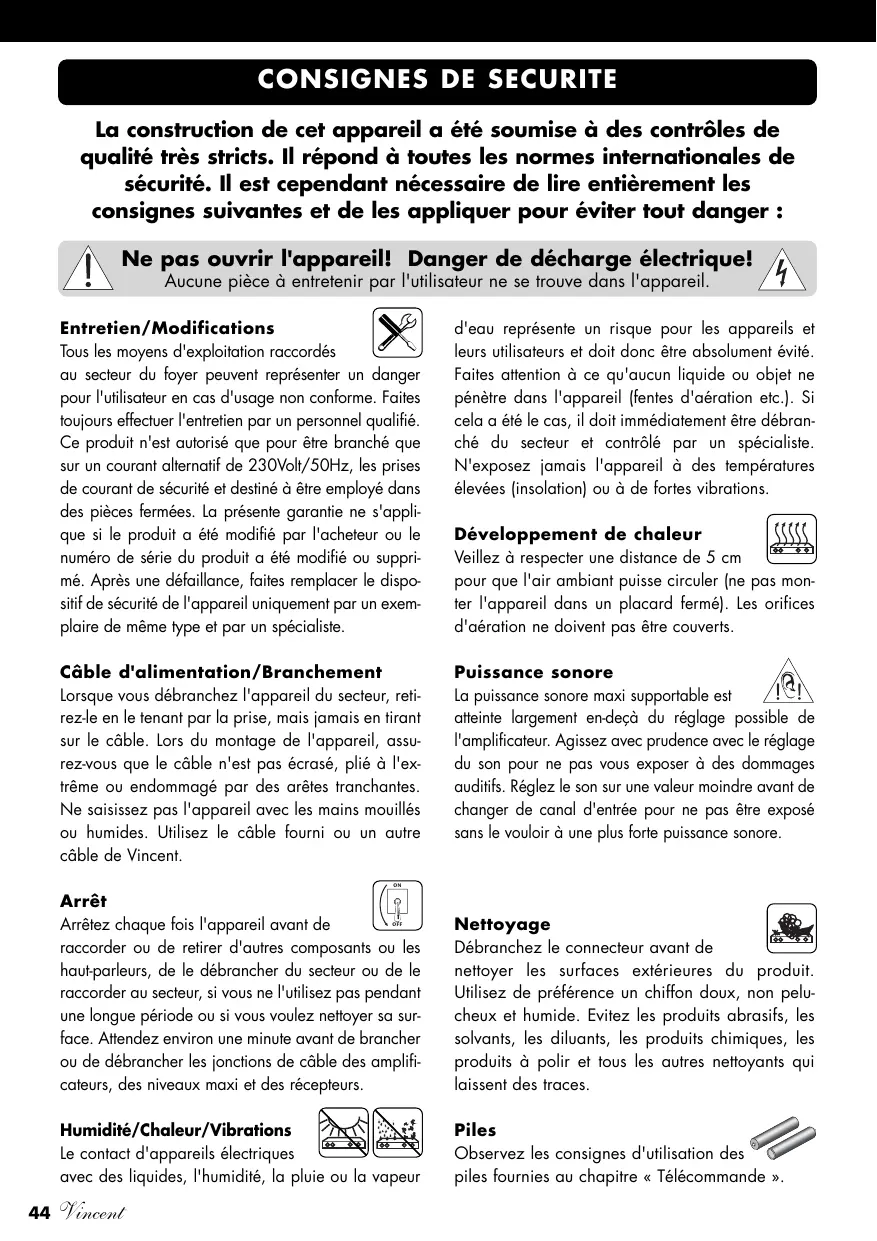 La construction de cet appareil a été soumise à des contrôles de qualité très stricts. Il répond à toutes les normes internationales de sécurité. Il est cependant nécessaire de lire entièrement les consignes suivantes et de les appliquer pour éviter tout danger : Ne pas ouvrir l'appareil! Danger de décharge électrique! Aucune pièce à entretenir par l'utilisateur ne se trouve dans l'appareil. Entretien/Modifications Tous les moyens d'exploitation raccordés au secteur du foyer peuvent représenter un danger pour l'utilisateur en cas d'usage non conforme. Faites toujours effectuer l'entretien par un personnel qualifié. Ce produit n'est autorisé que pour être branché que sur un courant alternatif de 230Volt/50Hz, les prises de courant de sécurité et destiné à être employé dans des pièces fermées. La présente garantie ne s'applique si le produit a été modifié par l'acheteur ou le numéro de série du produit a été modifié ou supprimé. Après une défaillance, faites remplacer le dispositif de sécurité de l'appareil uniquement par un exemplaire de même type et par un spécialiste. Câble d'alimentation/Branchement Lorsque vous débranchez l'appareil du secteur, retirez-le en le tenant par la prise, mais jamais en tirant sur le câble. Lors du montage de l'appareil, assurez-vous que le câble n'est pas écrasé, plié à l'extrême ou endommagé par des arêtes tranchantes. Ne saisissez pas l'appareil avec les mains mouillés ou humides. Utilisez le câble fourni ou un autre câble de Vincent. d'eau représente un risque pour les appareils et leurs utilisateurs et doit donc être absolument évité. Faites attention à ce qu'aucun liquide ou objet ne pénètre dans l'appareil (fentes d'aération etc.). Si cela a été le cas, il doit immédiatement être débranché du secteur et contrôlé par un spécialiste. N'exposez jamais l'appareil à des températures élevées (insolation) ou à de fortes vibrations. Développement de chaleur Veillez à respecter une distance de 5 cm pour que l'air ambiant puisse circuler (ne pas monter l'appareil dans un placard fermé). Les orifices d'aération ne doivent pas être couverts. Puissance sonore La puissance sonore maxi supportable est atteinte largement en-deçà du réglage possible de l'amplificateur. Agissez avec prudence avec le réglage du son pour ne pas vous exposer à des dommages auditifs. Réglez le son sur une valeur moindre avant de changer de canal d'entrée pour ne pas être exposé sans le vouloir à une plus forte puissance sonore.