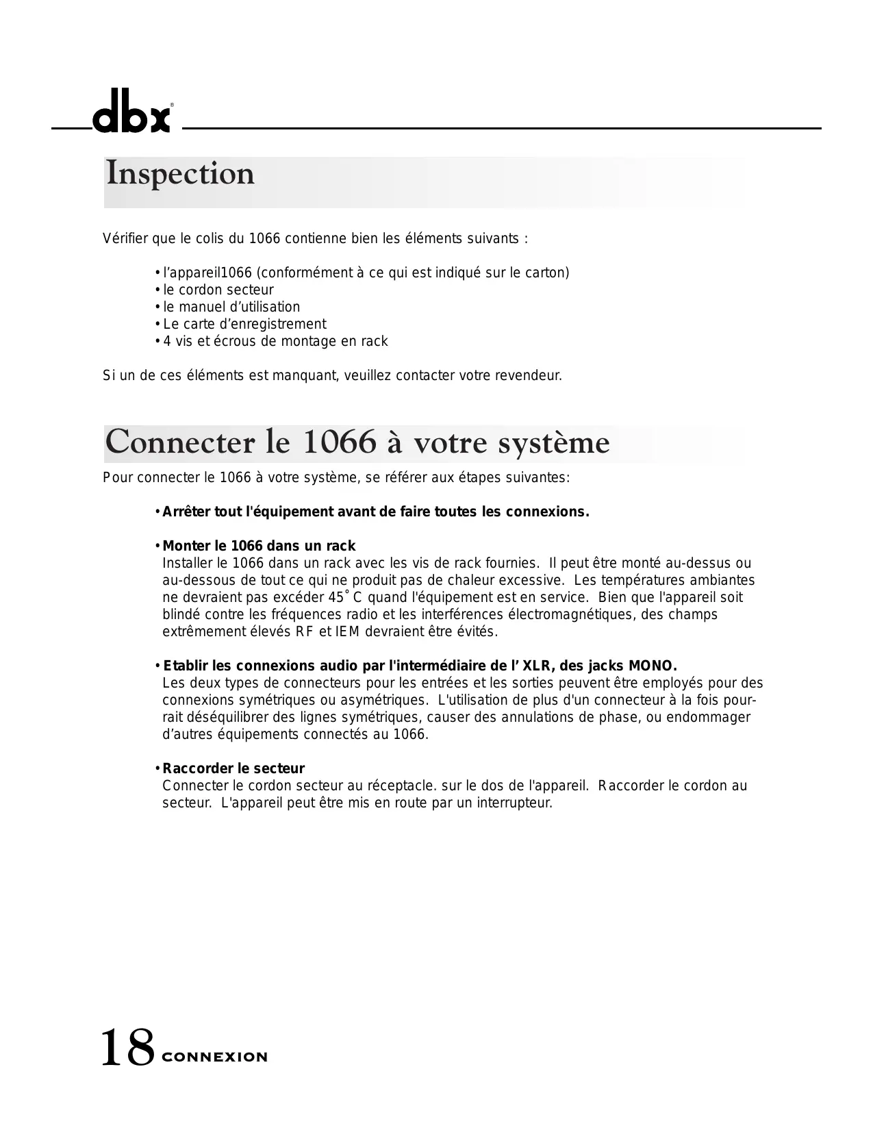 l’appareil1066 (conformément à ce qui est indiqué sur le carton) le cordon secteur le manuel d’utilisation Le carte d’enregistrement 4 vis et écrous de montage en rack Si un de ces éléments est manquant, veuillez contacter votre revendeur. Connecter le 1066 à votre système Pour connecter le 1066 à votre système, se référer aux étapes suivantes: