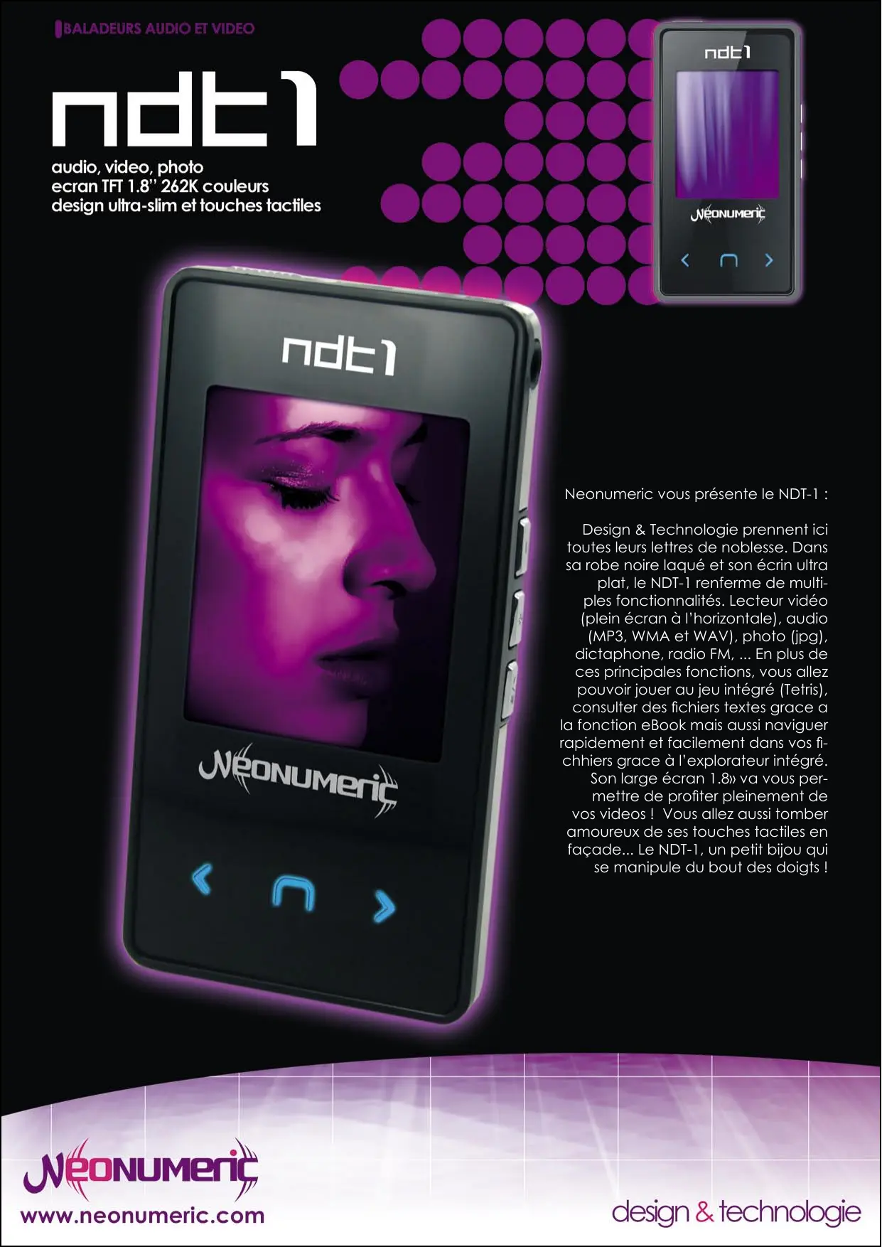NME? | Li audio, video, photo ecran TFT 1.8” 262K couleurs | design ultra-slim et touches tactiles | Jéanumeri Neonumeric vous présente le NDT-1 : Design & Technologie prennent ici toutes leurs lettres de noblesse. Dans sa robe noire laqué et son écrin ultra A plat, le NDT-1 renferme de multi- ples fonctionnalités. Lecteur vidéo (plein écran à l'horizontale), audio (MP3, WMA et WAV), photo (jpg), Al dictaphone, radio FM, … En plus de ces principales fonctions, vous allez pouvoir jouer au jeu intégré (Tetris), consulter des fichiers textes grace a la fonction eBook mais aussi naviguer rapidement et facilement dans vos fi- N Q chhiers grace à l'explorateur intégré. NUM : Son large écran 1.8» va vous per- eri | mettre de profiter pleinement de vos videos ! Vous allez aussi tomber amoureux de ses touches tactiles en façade... Le NDT-1, un petit bijou qui < se manipule du bout des doigfts ! WwWw.neonumeric.com design & technologie
