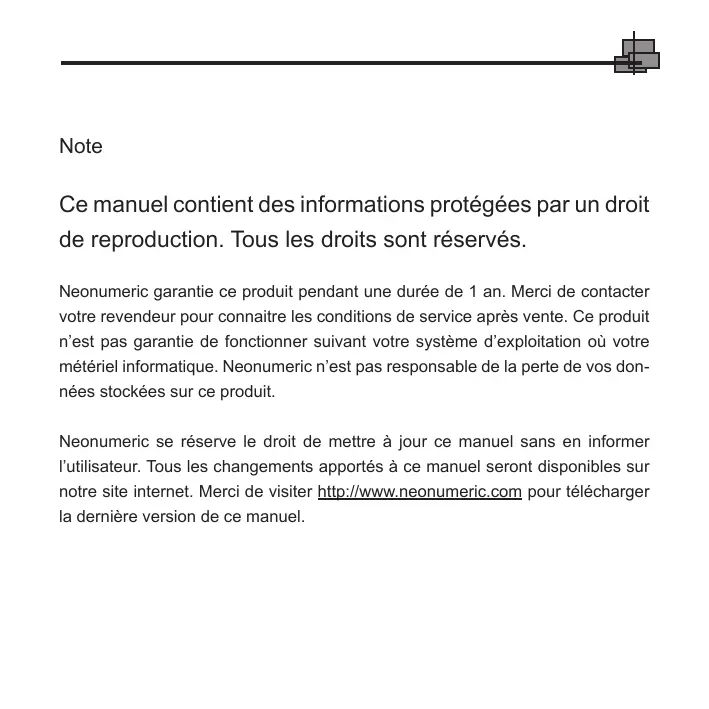 Neonumeric se réserve le droit de mettre à jour ce manuel sans en informer l’utilisateur. Tous les changements apportés à ce manuel seront disponibles sur notre site internet. Merci de visiter http://www.neonumeric.com pour télécharger la dernière version de ce manuel.