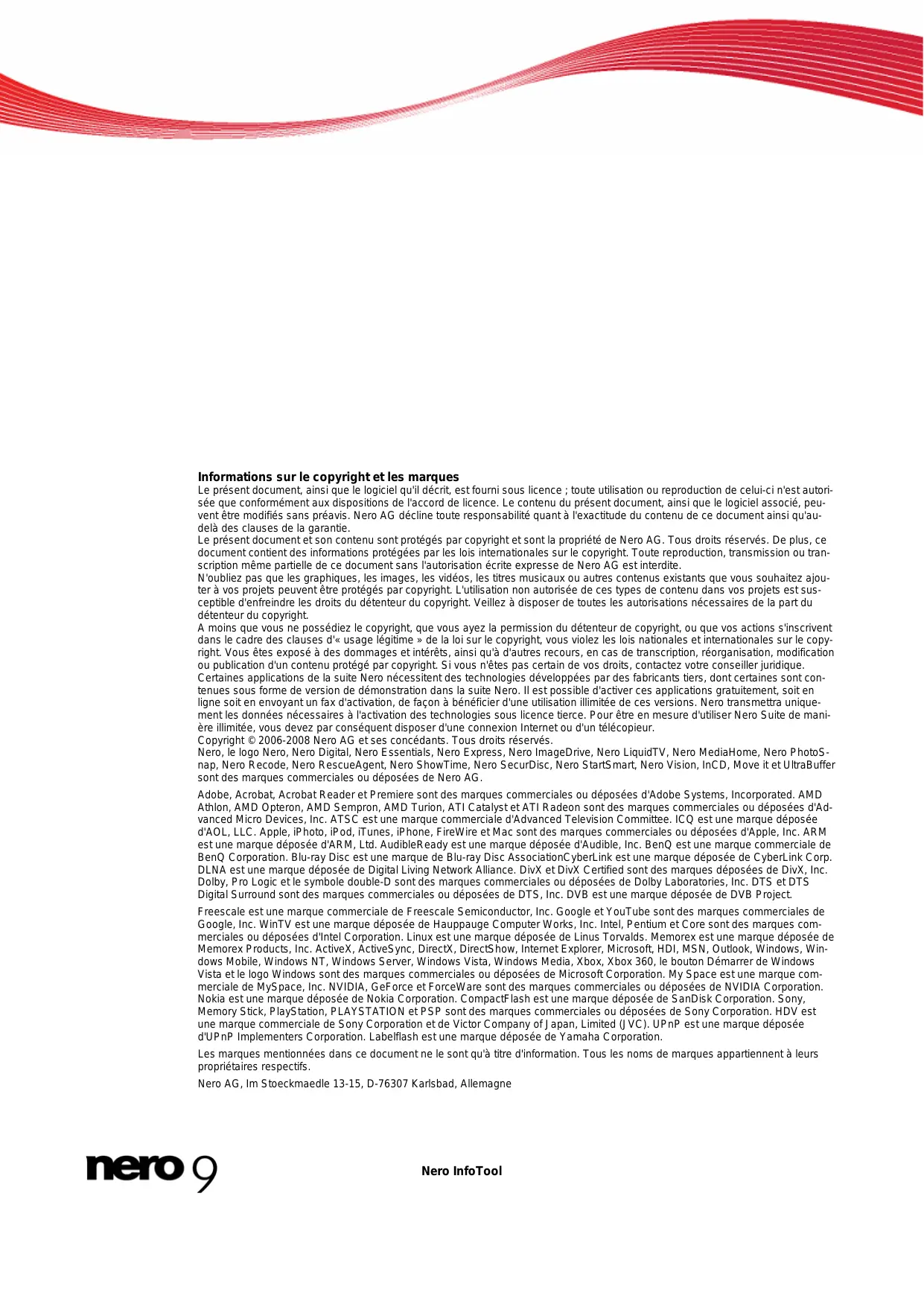 Manuel Nero InfoTool Copyright et marques Informations sur le copyright et les marques Le présent document, ainsi que le logiciel qu'il décrit, est fourni sous licence ; toute utilisation ou reproduction de celui-ci n'est autorisée que conformément aux dispositions de l'accord de licence. Le contenu du présent document, ainsi que le logiciel associé, peuvent être modifiés sans préavis. Nero AG décline toute responsabilité quant à l'exactitude du contenu de ce document ainsi qu'audelà des clauses de la garantie. Le présent document et son contenu sont protégés par copyright et sont la propriété de Nero AG. Tous droits réservés. De plus, ce document contient des informations protégées par les lois internationales sur le copyright. Toute reproduction, transmission ou transcription même partielle de ce document sans l'autorisation écrite expresse de Nero AG est interdite. N'oubliez pas que les graphiques, les images, les vidéos, les titres musicaux ou autres contenus existants que vous souhaitez ajouter à vos projets peuvent être protégés par copyright. L'utilisation non autorisée de ces types de contenu dans vos projets est susceptible d'enfreindre les droits du détenteur du copyright. Veillez à disposer de toutes les autorisations nécessaires de la part du détenteur du copyright. A moins que vous ne possédiez le copyright, que vous ayez la permission du détenteur de copyright, ou que vos actions s'inscrivent dans le cadre des clauses d'« usage légitime » de la loi sur le copyright, vous violez les lois nationales et internationales sur le copyright. Vous êtes exposé à des dommages et intérêts, ainsi qu'à d'autres recours, en cas de transcription, réorganisation, modification ou publication d'un contenu protégé par copyright. Si vous n'êtes pas certain de vos droits, contactez votre conseiller juridique. Certaines applications de la suite Nero nécessitent des technologies développées par des fabricants tiers, dont certaines sont contenues sous forme de version de démonstration dans la suite Nero. Il est possible d'activer ces applications gratuitement, soit en ligne soit en envoyant un fax d'activation, de façon à bénéficier d'une utilisation illimitée de ces versions. Nero transmettra uniquement les données nécessaires à l'activation des technologies sous licence tierce. Pour être en mesure d'utiliser Nero Suite de manière illimitée, vous devez par conséquent disposer d'une connexion Internet ou d'un télécopieur. Copyright © 2006-2008 Nero AG et ses concédants. Tous droits réservés. Nero, le logo Nero, Nero Digital, Nero Essentials, Nero Express, Nero ImageDrive, Nero LiquidTV, Nero MediaHome, Nero PhotoSnap, Nero Recode, Nero RescueAgent, Nero ShowTime, Nero SecurDisc, Nero StartSmart, Nero Vision, InCD, Move it et UltraBuffer sont des marques commerciales ou déposées de Nero AG. Adobe, Acrobat, Acrobat Reader et Premiere sont des marques commerciales ou déposées d'Adobe Systems, Incorporated. AMD Athlon, AMD Opteron, AMD Sempron, AMD Turion, ATI Catalyst et ATI Radeon sont des marques commerciales ou déposées d'Advanced Micro Devices, Inc. ATSC est une marque commerciale d'Advanced Television Committee. ICQ est une marque déposée d'AOL, LLC. Apple, iPhoto, iPod, iTunes, iPhone, FireWire et Mac sont des marques commerciales ou déposées d'Apple, Inc. ARM est une marque déposée d'ARM, Ltd. AudibleReady est une marque déposée d'Audible, Inc. BenQ est une marque commerciale de BenQ Corporation. Blu-ray Disc est une marque de Blu-ray Disc AssociationCyberLink est une marque déposée de CyberLink Corp. DLNA est une marque déposée de Digital Living Network Alliance. DivX et DivX Certified sont des marques déposées de DivX, Inc. Dolby, Pro Logic et le symbole double-D sont des marques commerciales ou déposées de Dolby Laboratories, Inc. DTS et DTS Digital Surround sont des marques commerciales ou déposées de DTS, Inc. DVB est une marque déposée de DVB Project. Freescale est une marque commerciale de Freescale Semiconductor, Inc. Google et YouTube sont des marques commerciales de Google, Inc. WinTV est une marque déposée de Hauppauge Computer Works, Inc. Intel, Pentium et Core sont des marques commerciales ou déposées d'Intel Corporation. Linux est une marque déposée de Linus Torvalds. Memorex est une marque déposée de Memorex Products, Inc. ActiveX, ActiveSync, DirectX, DirectShow, Internet Explorer, Microsoft, HDI, MSN, Outlook, Windows, Windows Mobile, Windows NT, Windows Server, Windows Vista, Windows Media, Xbox, Xbox 360, le bouton Démarrer de Windows Vista et le logo Windows sont des marques commerciales ou déposées de Microsoft Corporation. My Space est une marque commerciale de MySpace, Inc. NVIDIA, GeForce et ForceWare sont des marques commerciales ou déposées de NVIDIA Corporation. Nokia est une marque déposée de Nokia Corporation. CompactFlash est une marque déposée de SanDisk Corporation. Sony, Memory Stick, PlayStation, PLAYSTATION et PSP sont des marques commerciales ou déposées de Sony Corporation. HDV est une marque commerciale de Sony Corporation et de Victor Company of Japan, Limited (JVC). UPnP est une marque déposée d'UPnP Implementers Corporation. Labelflash est une marque déposée de Yamaha Corporation. Les marques mentionnées dans ce document ne le sont qu'à titre d'information. Tous les noms de marques appartiennent à leurs propriétaires respectifs. Nero AG, Im Stoeckmaedle 13-15, D-76307 Karlsbad, Allemagne Nero InfoTool Table des matières Table des matières