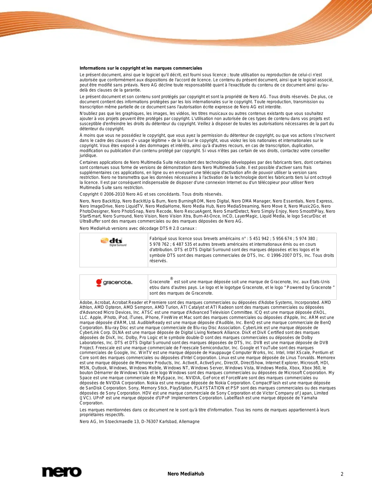 Gracenote est soit une marque déposée soit une marque de Gracenote, Inc. aux États-Unis et/ou dans d’autres pays. Le logo et le logotype Gracenote, et le logo “ Powered by Gracenote ” sont des marques de Gracenote. Adobe, Acrobat, Acrobat Reader et Premiere sont des marques commerciales ou déposées d'Adobe Systems, Incorporated. AMD Athlon, AMD Opteron, AMD Sempron, AMD Turion, ATI Catalyst et ATI Radeon sont des marques commerciales ou déposées d'Advanced Micro Devices, Inc. ATSC est une marque d'Advanced Television Committee. ICQ est une marque déposée d'AOL, LLC. Apple, iPhoto, iPod, iTunes, iPhone, FireWire et Mac sont des marques commerciales ou déposées d'Apple, Inc. ARM est une marque déposée d'ARM, Ltd. AudibleReady est une marque déposée d'Audible, Inc. BenQ est une marque commerciale de BenQ Corporation. Blu-ray Disc est une marque commerciale de Blu-ray Disc Association. CyberLink est une marque déposée de CyberLink Corp. DLNA est une marque déposée de Digital Living Network Alliance. DivX et DivX Certified sont des marques déposées de DivX, Inc. Dolby, Pro Logic et le symbole double-D sont des marques commerciales ou déposées de Dolby Laboratories, Inc. DTS et DTS Digital Surround sont des marques déposées de DTS, Inc. DVB est une marque déposée de DVB Project. Freescale est une marque commerciale de Freescale Semiconductor, Inc. Google et YouTube sont des marques commerciales de Google, Inc. WinTV est une marque déposée de Hauppauge Computer Works, Inc. Intel, Intel XScale, Pentium et Core sont des marques commerciales ou déposées d'Intel Corporation. Linux est une marque déposée de Linus Torvalds. Memorex est une marque déposée de Memorex Products, Inc. ActiveX, ActiveSync, DirectX, DirectShow, Internet Explorer, Microsoft, HDI, MSN, Outlook, Windows, Windows Mobile, Windows NT, Windows Server, Windows Vista, Windows Media, Xbox, Xbox 360, le bouton Démarrer de Windows Vista et le logo Windows sont des marques commerciales ou déposées de Microsoft Corporation. My Space est une marque commerciale de MySpace, Inc. NVIDIA, GeForce et ForceWare sont des marques commerciales ou déposées de NVIDIA Corporation. Nokia est une marque déposée de Nokia Corporation. CompactFlash est une marque déposée de SanDisk Corporation. Sony, Memory Stick, PlayStation, PLAYSTATION et PSP sont des marques commerciales ou des marques déposées de Sony Corporation. HDV est une marque commerciale de Sony Corporation et de Victor Company of Japan, Limited (JVC). UPnP est une marque déposée d'UPnP Implementers Corporation. Labelflash est une marque déposée de Yamaha Corporation. Les marques mentionnées dans ce document ne le sont qu'à titre d'information. Tous les noms de marques appartiennent à leurs propriétaires respectifs. Nero AG, Im Stoeckmaedle 13, D-76307 Karlsbad, Allemagne Nero MediaHub