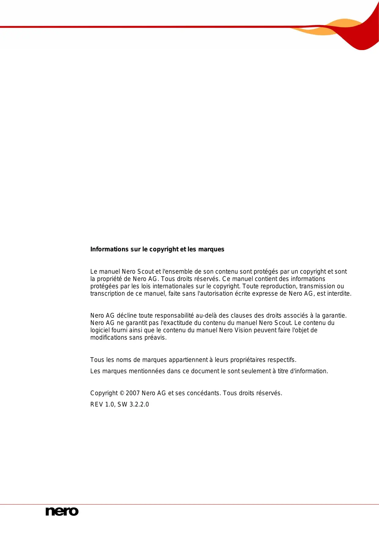 Informations sur le copyright et les marques Le manuel Nero Scout et l'ensemble de son contenu sont protégés par un copyright et sont la propriété de Nero AG. Tous droits réservés. Ce manuel contient des informations protégées par les lois internationales sur le copyright. Toute reproduction, transmission ou transcription de ce manuel, faite sans l'autorisation écrite expresse de Nero AG, est interdite. Nero AG décline toute responsabilité au-delà des clauses des droits associés à la garantie. Nero AG ne garantit pas l'exactitude du contenu du manuel Nero Scout. Le contenu du logiciel fourni ainsi que le contenu du manuel Nero Vision peuvent faire l'objet de modifications sans préavis. Tous les noms de marques appartiennent à leurs propriétaires respectifs. Les marques mentionnées dans ce document le sont seulement à titre d'information. Copyright © 2007 Nero AG etses concédants. Tous droits réservés. REV 1.0, SW 3.2.2.0