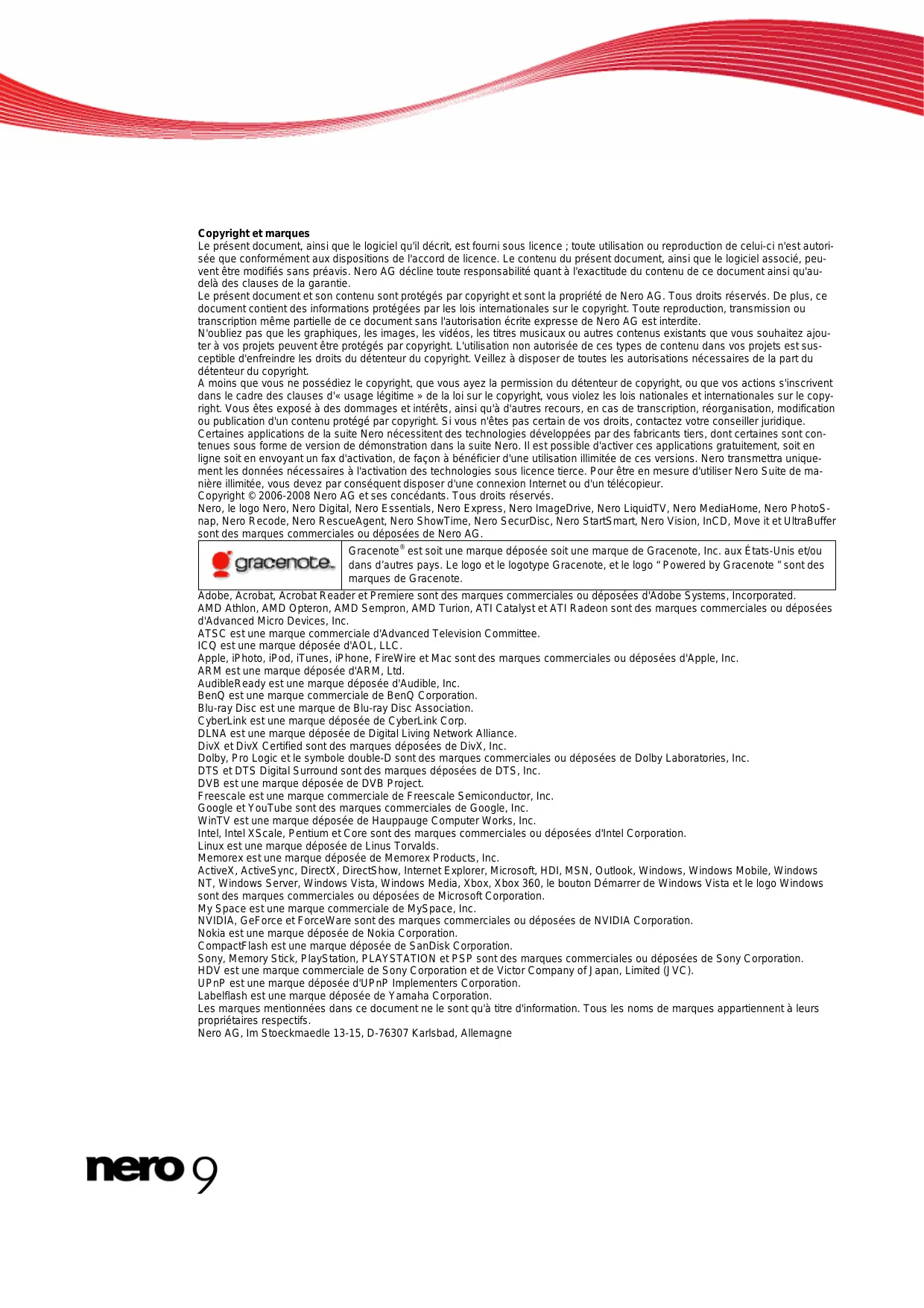 Manuel Nero StartSmart Copyright et marques Copyright et marques Le présent document, ainsi que le logiciel qu'il décrit, est fourni sous licence ; toute utilisation ou reproduction de celui-ci n'est autorisée que conformément aux dispositions de l'accord de licence. Le contenu du présent document, ainsi que le logiciel associé, peuvent être modifiés sans préavis. Nero AG décline toute responsabilité quant à l'exactitude du contenu de ce document ainsi qu'audelà des clauses de la garantie. Le présent document et son contenu sont protégés par copyright et sont la propriété de Nero AG. Tous droits réservés. De plus, ce document contient des informations protégées par les lois internationales sur le copyright. Toute reproduction, transmission ou transcription même partielle de ce document sans l'autorisation écrite expresse de Nero AG est interdite. N'oubliez pas que les graphiques, les images, les vidéos, les titres musicaux ou autres contenus existants que vous souhaitez ajouter à vos projets peuvent être protégés par copyright. L'utilisation non autorisée de ces types de contenu dans vos projets est susceptible d'enfreindre les droits du détenteur du copyright. Veillez à disposer de toutes les autorisations nécessaires de la part du détenteur du copyright. A moins que vous ne possédiez le copyright, que vous ayez la permission du détenteur de copyright, ou que vos actions s'inscrivent dans le cadre des clauses d'« usage légitime » de la loi sur le copyright, vous violez les lois nationales et internationales sur le copyright. Vous êtes exposé à des dommages et intérêts, ainsi qu'à d'autres recours, en cas de transcription, réorganisation, modification ou publication d'un contenu protégé par copyright. Si vous n'êtes pas certain de vos droits, contactez votre conseiller juridique. Certaines applications de la suite Nero nécessitent des technologies développées par des fabricants tiers, dont certaines sont contenues sous forme de version de démonstration dans la suite Nero. Il est possible d'activer ces applications gratuitement, soit en ligne soit en envoyant un fax d'activation, de façon à bénéficier d'une utilisation illimitée de ces versions. Nero transmettra uniquement les données nécessaires à l'activation des technologies sous licence tierce. Pour être en mesure d'utiliser Nero Suite de manière illimitée, vous devez par conséquent disposer d'une connexion Internet ou d'un télécopieur. Copyright © 2006-2008 Nero AG et ses concédants. Tous droits réservés. Nero, le logo Nero, Nero Digital, Nero Essentials, Nero Express, Nero ImageDrive, Nero LiquidTV, Nero MediaHome, Nero PhotoSnap, Nero Recode, Nero RescueAgent, Nero ShowTime, Nero SecurDisc, Nero StartSmart, Nero Vision, InCD, Move it et UltraBuffer sont des marques commerciales ou déposées de Nero AG. Gracenote® est soit une marque déposée soit une marque de Gracenote, Inc. aux États-Unis et/ou dans d’autres pays. Le logo et le logotype Gracenote, et le logo “ Powered by Gracenote ” sont des marques de Gracenote. Adobe, Acrobat, Acrobat Reader et Premiere sont des marques commerciales ou déposées d'Adobe Systems, Incorporated. AMD Athlon, AMD Opteron, AMD Sempron, AMD Turion, ATI Catalyst et ATI Radeon sont des marques commerciales ou déposées d'Advanced Micro Devices, Inc. ATSC est une marque commerciale d'Advanced Television Committee. ICQ est une marque déposée d'AOL, LLC. Apple, iPhoto, iPod, iTunes, iPhone, FireWire et Mac sont des marques commerciales ou déposées d'Apple, Inc. ARM est une marque déposée d'ARM, Ltd. AudibleReady est une marque déposée d'Audible, Inc. BenQ est une marque commerciale de BenQ Corporation. Blu-ray Disc est une marque de Blu-ray Disc Association. CyberLink est une marque déposée de CyberLink Corp. DLNA est une marque déposée de Digital Living Network Alliance. DivX et DivX Certified sont des marques déposées de DivX, Inc. Dolby, Pro Logic et le symbole double-D sont des marques commerciales ou déposées de Dolby Laboratories, Inc. DTS et DTS Digital Surround sont des marques déposées de DTS, Inc. DVB est une marque déposée de DVB Project. Freescale est une marque commerciale de Freescale Semiconductor, Inc. Google et YouTube sont des marques commerciales de Google, Inc. WinTV est une marque déposée de Hauppauge Computer Works, Inc. Intel, Intel XScale, Pentium et Core sont des marques commerciales ou déposées d'Intel Corporation. Linux est une marque déposée de Linus Torvalds. Memorex est une marque déposée de Memorex Products, Inc. ActiveX, ActiveSync, DirectX, DirectShow, Internet Explorer, Microsoft, HDI, MSN, Outlook, Windows, Windows Mobile, Windows NT, Windows Server, Windows Vista, Windows Media, Xbox, Xbox 360, le bouton Démarrer de Windows Vista et le logo Windows sont des marques commerciales ou déposées de Microsoft Corporation. My Space est une marque commerciale de MySpace, Inc. NVIDIA, GeForce et ForceWare sont des marques commerciales ou déposées de NVIDIA Corporation. Nokia est une marque déposée de Nokia Corporation. CompactFlash est une marque déposée de SanDisk Corporation. Sony, Memory Stick, PlayStation, PLAYSTATION et PSP sont des marques commerciales ou déposées de Sony Corporation. HDV est une marque commerciale de Sony Corporation et de Victor Company of Japan, Limited (JVC). UPnP est une marque déposée d'UPnP Implementers Corporation. Labelflash est une marque déposée de Yamaha Corporation. Les marques mentionnées dans ce document ne le sont qu'à titre d'information. Tous les noms de marques appartiennent à leurs propriétaires respectifs. Nero AG, Im Stoeckmaedle 13-15, D-76307 Karlsbad, Allemagne Table des matières Table des matières