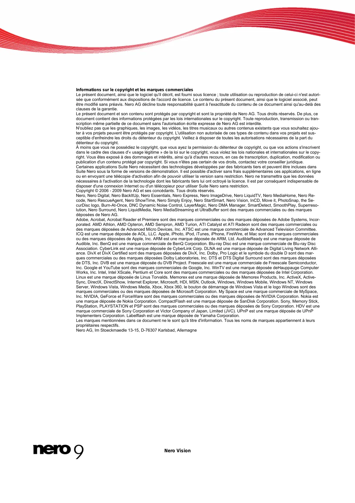 Manuel Nero Vision Copyright et marques Informations sur le copyright et les marques commerciales Le présent document, ainsi que le logiciel qu'il décrit, est fourni sous licence ; toute utilisation ou reproduction de celui-ci n'est autorisée que conformément aux dispositions de l'accord de licence. Le contenu du présent document, ainsi que le logiciel associé, peut être modifié sans préavis. Nero AG décline toute responsabilité quant à l'exactitude du contenu de ce document ainsi qu'au-delà des clauses de la garantie. Le présent document et son contenu sont protégés par copyright et sont la propriété de Nero AG. Tous droits réservés. De plus, ce document contient des informations protégées par les lois internationales sur le copyright. Toute reproduction, transmission ou transcription même partielle de ce document sans l'autorisation écrite expresse de Nero AG est interdite. N'oubliez pas que les graphiques, les images, les vidéos, les titres musicaux ou autres contenus existants que vous souhaitez ajouter à vos projets peuvent être protégés par copyright. L'utilisation non autorisée de ces types de contenu dans vos projets est susceptible d'enfreindre les droits du détenteur du copyright. Veillez à disposer de toutes les autorisations nécessaires de la part du détenteur du copyright. À moins que vous ne possédiez le copyright, que vous ayez la permission du détenteur de copyright, ou que vos actions s'inscrivent dans le cadre des clauses d'« usage légitime » de la loi sur le copyright, vous violez les lois nationales et internationales sur le copyright. Vous êtes exposé à des dommages et intérêts, ainsi qu'à d'autres recours, en cas de transcription, duplication, modification ou publication d'un contenu protégé par copyright. Si vous n'êtes pas certain de vos droits, contactez votre conseiller juridique. Certaines applications Suite Nero nécessitent des technologies développées par des fabricants tiers et peuvent être incluses dans Suite Nero sous la forme de versions de démonstration. Il est possible d'activer sans frais supplémentaires ces applications, en ligne ou en envoyant une télécopie d'activation afin de pouvoir utiliser la version sans restriction. Nero ne transmettra que les données nécessaires à l'activation de la technologie dont les fabricants tiers lui ont octroyé la licence. Il est par conséquent indispensable de disposer d'une connexion Internet ou d'un télécopieur pour utiliser Suite Nero sans restriction. Copyright © 2006 - 2009 Nero AG et ses concédants. Tous droits réservés. Nero, Nero Digital, Nero BackItUp, Nero Essentials, Nero Express, Nero ImageDrive, Nero LiquidTV, Nero MediaHome, Nero Recode, Nero RescueAgent, Nero ShowTime, Nero Simply Enjoy, Nero StartSmart, Nero Vision, InCD, Move it, PhotoSnap, the SecurDisc logo, Burn-At-Once, DNC Dynamic Noise Control, LayerMagic, Nero DMA Manager, SmartDetect, SmoothPlay, Superresolution, Nero Surround, Nero LiquidMedia, Nero MediaStreaming et UltraBuffer sont des marques commerciales ou des marques déposées de Nero AG. Adobe, Acrobat, Acrobat Reader et Premiere sont des marques commerciales ou des marques déposées de Adobe Systems, Incorporated. AMD Athlon, AMD Opteron, AMD Sempron, AMD Turion, ATI Catalyst et ATI Radeon sont des marques commerciales ou des marques déposées de Advanced Micro Devices, Inc. ATSC est une marque commerciale de Advanced Television Committee. ICQ est une marque déposée de AOL, LLC. Apple, iPhoto, iPod, iTunes, iPhone, FireWire, et Mac sont des marques commerciales ou des marques déposées de Apple, Inc. ARM est une marque déposée de ARM, Ltd. AudibleReady est une marque déposée de Audible, Inc. BenQ est une marque commerciale de BenQ Corporation. Blu-ray Disc est une marque commerciale de Blu-ray Disc Association. CyberLink est une marque déposée de CyberLink Corp. DLNA est une marque déposée de Digital Living Network Alliance. DivX et DivX Certified sont des marques déposées de DivX, Inc. Dolby, Pro Logic et le symbole du double D sont des marques commerciales ou des marques déposées Dolby Laboratories, Inc. DTS et DTS Digital Surround sont des marques déposées de DTS, Inc. DVB est une marque déposée du DVB Project. Freescale est une marque commerciale de Freescale Semiconductor, Inc. Google et YouTube sont des marques commerciales de Google, Inc. WinTV est une marque déposée deHauppauge Computer Works, Inc. Intel, Intel XScale, Pentium et Core sont des marques commerciales ou des marques déposées de Intel Corporation. Linux est une marque déposée de Linus Torvalds. Memorex est une marque déposée de Memorex Products, Inc. ActiveX, ActiveSync, DirectX, DirectShow, Internet Explorer, Microsoft, HDI, MSN, Outlook, Windows, Windows Mobile, Windows NT, Windows Server, Windows Vista, Windows Media, Xbox, Xbox 360, le bouton de démarrage de Windows Vista et le logo Windows sont des marques commerciales ou des marques déposées de Microsoft Corporation. My Space est une marque commerciale de MySpace, Inc. NVIDIA, GeForce et ForceWare sont des marques commerciales ou des marques déposées de NVIDIA Corporation. Nokia est une marque déposée de Nokia Corporation. CompactFlash est une marque déposée de SanDisk Corporation. Sony, Memory Stick, PlayStation, PLAYSTATION et PSP sont des marques commerciales ou des marques déposées de Sony Corporation. HDV est une marque commerciale de Sony Corporation et Victor Company of Japan, Limited (JVC). UPnP est une marque déposée de UPnP Implementers Corporation. Labelflash est une marque déposée de Yamaha Corporation. Les marques mentionnées dans ce document ne le sont qu'à titre d'information. Tous les noms de marques appartiennent à leurs propriétaires respectifs. Nero AG, Im Stoeckmaedle 13-15, D-76307 Karlsbad, Allemagne Nero Vision Table des matières Table des matières