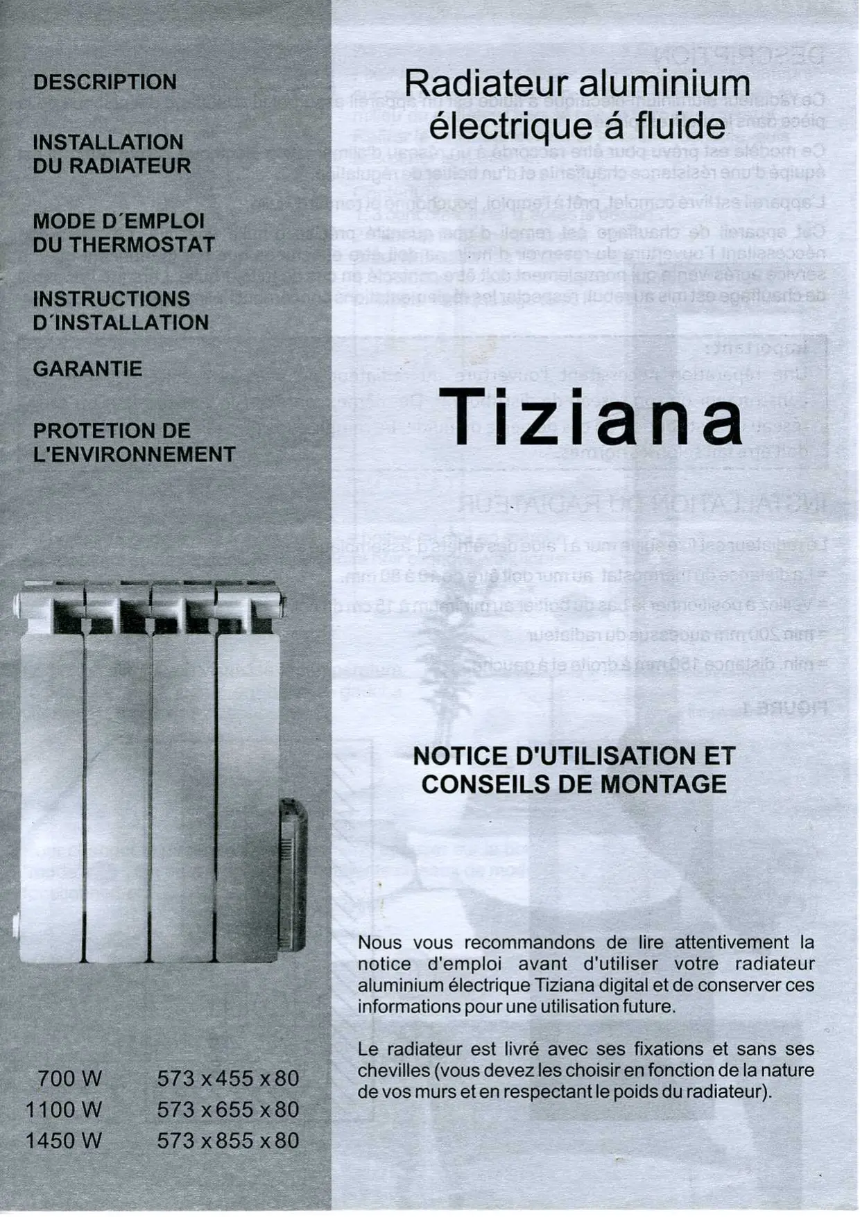 Nous vous recommandons de lire attentivement la notice d'emploi avant d'utiliser votre radiateur aluminium électrique Tiziana digital et de conserver ces informations pour une utilisation future.