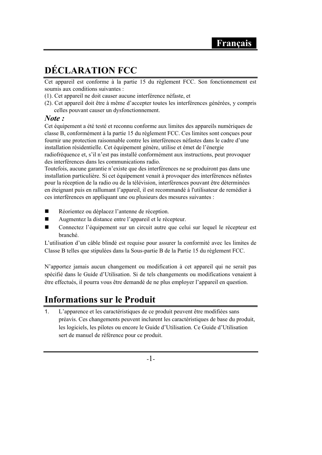 Réorientez ou déplacez l’antenne de réception. Augmentez la distance entre l’appareil et le récepteur. Connectez l’équipement sur un circuit autre que celui sur lequel le récepteur est branché. L’utilisation d’un câble blindé est requise pour assurer la conformité avec les limites de Classe B telles que stipulées dans la Sous-partie B de la Partie 15 du règlement FCC. N’apportez jamais aucun changement ou modification à cet appareil qui ne serait pas spécifié dans le Guide d’Utilisation. Si de tels changements ou modifications venaient à être effectués, il pourra vous être demandé de ne plus employer l’appareil en question. Informations sur le Produit