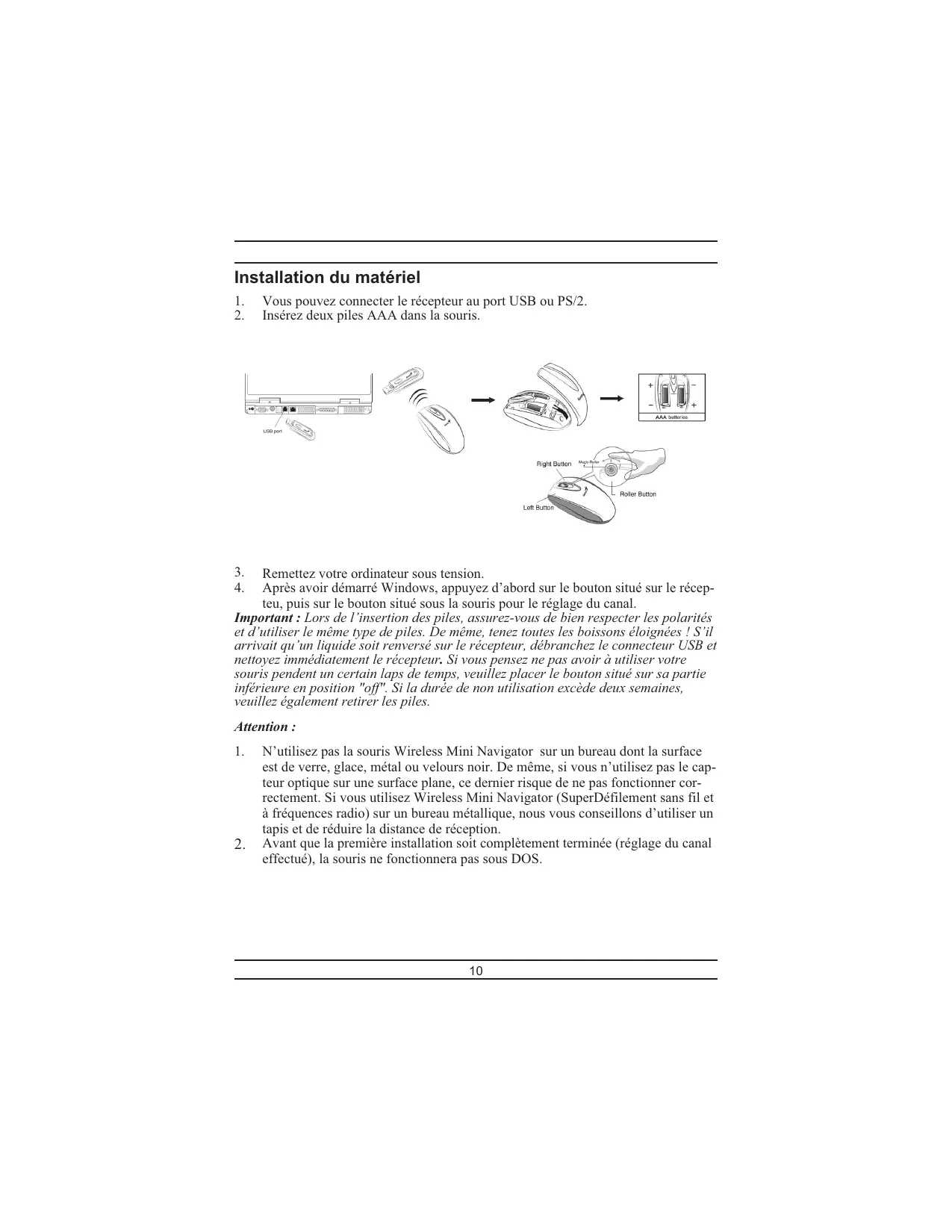 N’utilisez pas la souris Wireless Mini Navigator sur un bureau dont la surface est de verre, glace, métal ou velours noir. De même, si vous n’utilisez pas le capteur optique sur une surface plane, ce dernier risque de ne pas fonctionner correctement. Si vous utilisez Wireless Mini Navigator (SuperDéfilement sans fil et à fréquences radio) sur un bureau métallique, nous vous conseillons d’utiliser un tapis et de réduire la distance de réception. Avant que la première installation soit complètement terminée (réglage du canal effectué), la souris ne fonctionnera pas sous DOS.