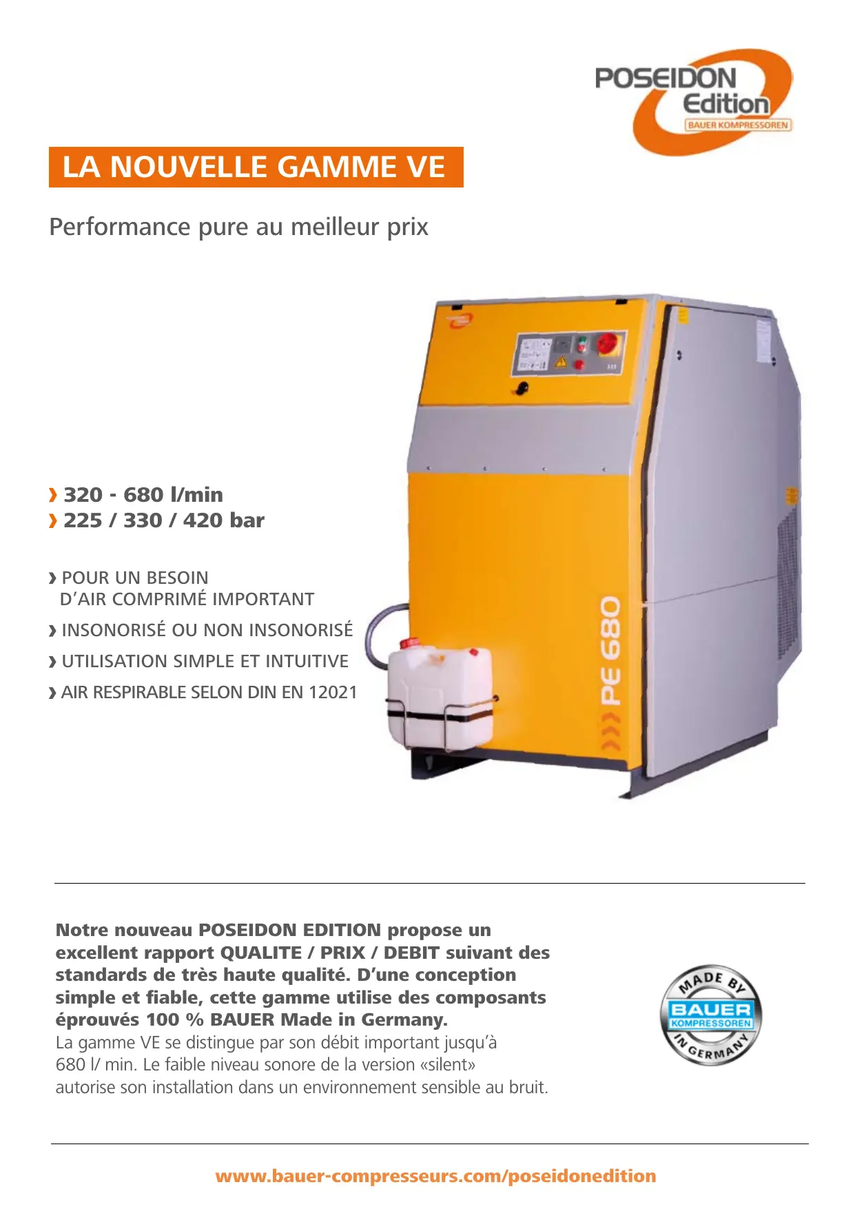 225 / 330 / 420 bar Pour un besoin d’air comprimé important Insonorisé ou non insonorisé Utilisation simple et intuitive Air Respirable selon DIN EN 12021 Notre nouveau POSEIDON EDITION propose un excellent rapport QUALITE / PRIX / DEBIT suivant des standards de très haute qualité. D’une conception simple et fiable, cette gamme utilise des composants éprouvés 100 % BAUER Made in Germany. La gamme VE se distingue par son débit important jusqu’à 680 l/ min. Le faible niveau sonore de la version «silent» autorise son installation dans un environnement sensible au bruit. www.bauer-compresseurs.com/poseidonedition BAUER KOMPRESSOREN gamme VE Des équipements convaincants FONCTIONNEMENT AUTOMATIQUE Les compresseurs de la gamme VE permettent de garantir une sécurité optimale de fonctionnement. En effet, la gamme VE est équipée d’ún automatisme simple et fiable avec son système de purge automatique des condensats á faible émission sonore. Arrêt et démarrage automatique pour contrôle automatique du compresseur. La purge automatique de condensats vidange les séparateurs inter étages et final pendant la marche du groupe ainsi qu’à chaque arrêt. Une alarme de pression d’huile avec voyant en façade permet la mise en sécurité du groupe en cas de manque d’huile ou du mauvais sens de rotation du bloc. Un compteur horaire permet de prévoir les intervalles de maintenance. PE 500 VE en version non-insonorisée
