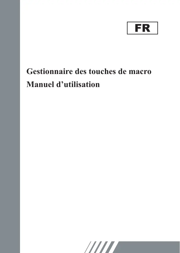 Gestionnaire des touches de macro Manuel d’utilisation Macro Key Manager Introduction Le Gestionnaire des touches de macro est un logiciel spécial pour tablette. Vous pouvez configurer des raccourcis-clavier (Copier = “Ctrl+C”) ou les hyperliens que vous utilisez le plus souvent. Puis enregistrez-les en tant que profil de touche de macro favori. Il existe plusieurs profils par défaut. Certaines touches de macro sont des touches par défaut dont les paramètres ne peuvent être modifiés. Certaines touches de macro sont personnalisables. Leurs paramètres peuvent être définis et modifiés. Si les profils par défaut ne répondent pas à vos besoins, vous pouvez en créer d’autres. Etant donné que les événements clavier ne sont pas uniformes, la fonction « open.exe » est fournie pour adapter le profil du gestionnaire des touches de macro aux logiciels. Si vous n’utilisez pas le fichier « open.exe », le gestionnaire des touches de macro peut fonctionner de façon imprévisible dans certains logiciels.