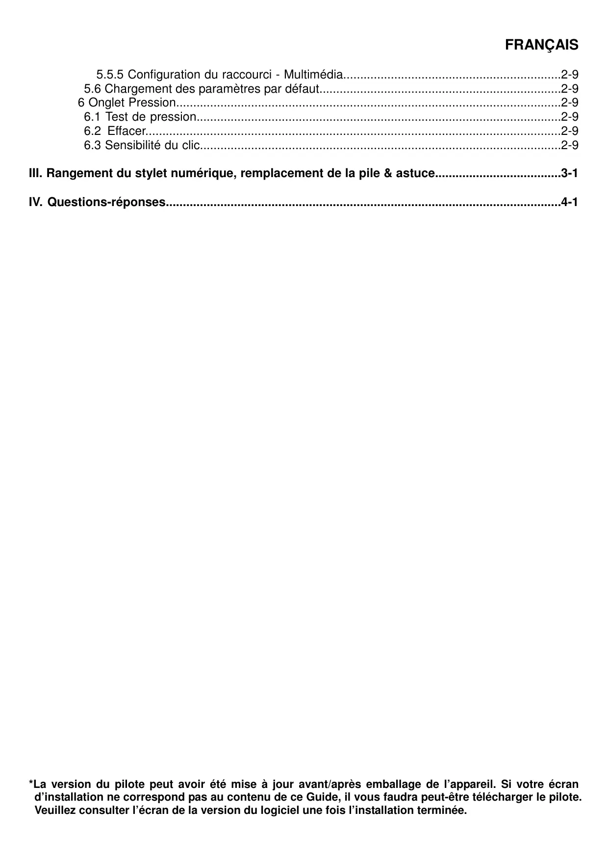 IV. Questions-réponses....................................................................................................................4-1 *La version du pilote peut avoir été mise à jour avant/après emballage de l’appareil. Si votre écran d’installation ne correspond pas au contenu de ce Guide, il vous faudra peut-être télécharger le pilote. Veuillez consulter l’écran de la version du logiciel une fois l’installation terminée.