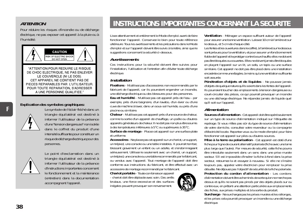 Fixations - N’utilisez pas d’accessoires non recommandés par le fabricant de l’appareil, car ils pourraient engendrer un incendie, une décharge électrique ou des blessures pour des personnes. Eau et humidité - N’utilisez pas cet appareil près de l’eau - par exemple, près d’une baignoire, d’un lavabo, d’un évier ou d’une cuve de machine à laver, dans un sous-sol humide, ou près d’une piscine ou similaire. Chaleur - N’utilisez pas cet appareil près d’une source de chaleur, comme la sortie d’un appareil de chauffage, un poêle ou d’autres appareils générateurs de chaleur. Il ne doit pas non plus être soumis à des températures inférieures à 5˚C ou supérieures à 35˚C. Surface de montage - Placez cet appareil sur une surface plate et uniforme. Accessoires - Ne placez pas cet appareil sur un chariot, un support, un trépied, une console ou une table instables. Il pourrait tomber, blessant gravement un enfant ou un adulte, et s’endommageant sérieusement. Utilisez-le seulement avec un chariot, un support, un trépied, une console ou une table recommandés par le fabricant, ou vendus avec l’appareil. Tout montage de l’appareil doit être conforme aux instructions du fabricant, et être effectué avec un accessoire de montage recommandé par le fabricant. Chariot portable - Toute combinaison appareil - chariot doit être déplacée avec soin. Des arrêts brutaux, une force excessive et des surfaces inégales peuvent provoquer son renversement. Ventilation - Ménagez un espace suffisant autour de l’appareil pour assurer une bonne ventilation. Laissez 10 cm à l’arrière et sur le dessus, et 5 cm de chaque côté. Les fentes et les ouvertures dans le coffret, à l’arrière et sur le dessous sont prévues pour la ventilation, et pour assurer un fonctionnement fiable de l’appareil et le protéger contre la surchauffe; elles ne doivent pas être bloquées ou couvertes. Elles ne doivent jamais être bloquées en plaçant l’appareil sur un lit, un sofa, un tapis ou une surface similaire. Cet appareil ne doit pas être placé dans une installation encastrée comme une étagère, à moins qu’une ventilation suffisante soit assurée. Pénétration d’objets et de liquides - Ne poussez jamais d’objets de quelque nature qu’ils soient dans les fentes de l’appareil. Ils pourraient toucher des emplacements à tension dangereuse ou court-circuiter des pièces, ce qui pourrait provoquer un incendie ou une décharge électrique. Ne répandez jamais de liquide quel qu’il soit sur l’appareil. Alimentation Sources d’alimentation - Cet appareil doit être opéré seulement sur un type de source d’alimentation indiqué sur l’étiquette de repérage. Si vous n’êtes pas sûr du type de source d’alimentation de votre domicile, consultez votre revendeur ou la compagnie d’électricité locale. Reportez-vous ou le mode d’emploi pour faire fonctionner cet appareil sur piles ou d’autres sources. Mise à la terre ou polarisation - Cet appareil est doté d’une fiche pour ligne de courant alternatif polarisée (fiche avec une lame plus large que l’autre). Par mesure de sécurité, cette fiche pourra être introduite seulement dans un sens dans une prise murale secteur. S’il est impossible d’insérer la fiche à fond dans la prise secteur, retournez-la et essayez à nouveau. Si elle ne s’insère toujours pas, appelez votre électricien pour remplacer la prise désuète. Ne déjouez pas l’objectif de sécurité de la fiche polarisée. Protection du cordon d’alimentation - Les cordons d’alimentation doivent être acheminés de sorte qu’on ne marche pas dessus et qu’ils ne soient pas pincés par des objets placés sur ou contre eux, en prêtant une attention particulière aux emplacements des fiches, aux prises multiples et à la sortie du produit. Surcharge - Ne surchargez pas les prises murales et les rallonges, et les prises cela pourrait provoquer un incendie ou une décharge électrique.