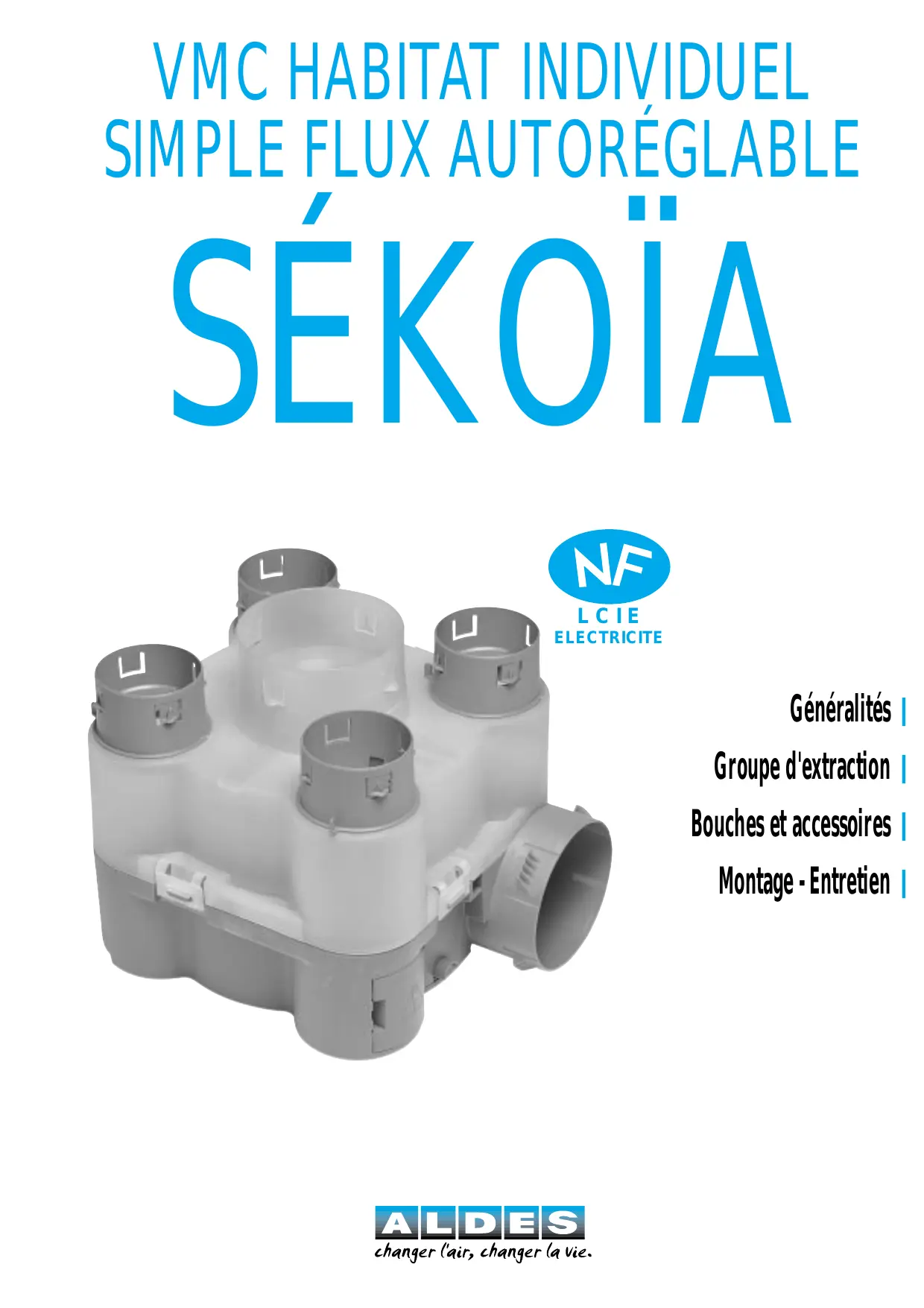 LCIE ELECTRICITE Généralités ■ Groupe d'extraction ■ Bouches et accessoires ■ Montage - Entretien ■ Généralités ■ PRINCIPE ■ CONFORMITÉ Le SÉKOÏA est un groupe simple flux autoréglable destiné à toutes les maisons individuelles en neuf ou en rénovation. Rapports d'essais : – aérauliques et acoustiques : PV CETIAT N° 92-08-60/5, – électrique : certification Electricité, rapport LCIE N° 17017020. Il peut être installé sans difficulté dans les maisons individuelles ayant jusqu'à 4 sanitaires. Conformité aux réglementations et normes :