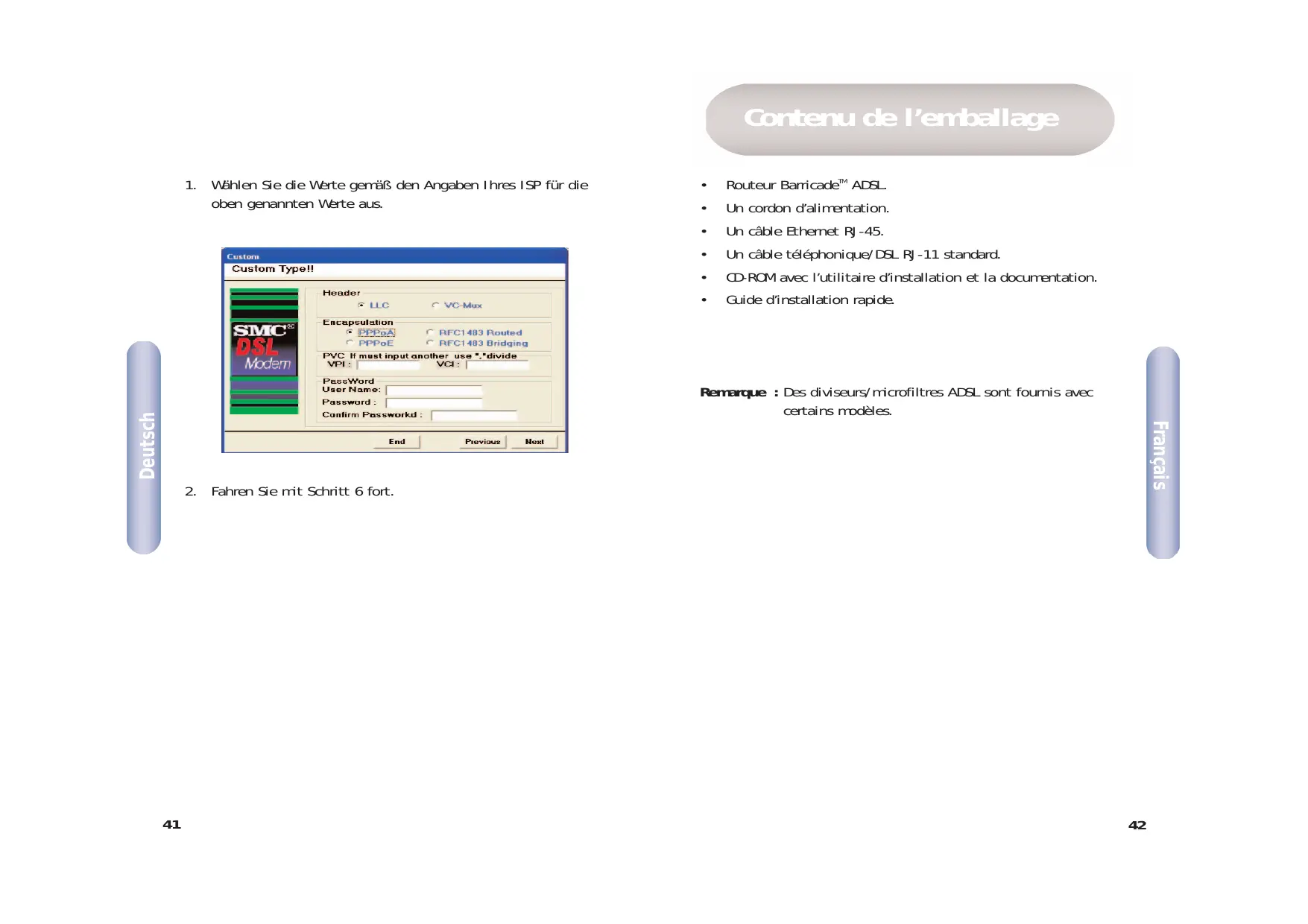 va maintenant configurer le routeur BarricadeTM ADSL avec les paramètres que vous avez saisis. Cette opération peut durer quelques minutes. Lorsque la configuration est terminée, le message suivant s’affiche : Personnalisé Si votre pays ou votre FAI ne figure pas dans la liste, vous devrez entrer manuellement vos paramètres de FAI. Cette opération s’effectue en utilisant l’option [Custom] (Personnalisé). Pour une installation personnalisée, vous aurez également besoin de connaître les paramètres suivants fournis par votre FAI : Français Français Protocole? (PPPoA, PPPoE, RFC1483 Bridging ou RFC1483 Routed). Encapsulation ? (VC-Mux ou LLC). Numéros de circuits VPI/VCI ? Par exemple 0/38. Votre router BarricadeTM ADSL est maintenant configuré. Reportezvous à la section Dépannage du Manuel d’utilisation si vous ne parvenez pas à établir de connexion à Internet.