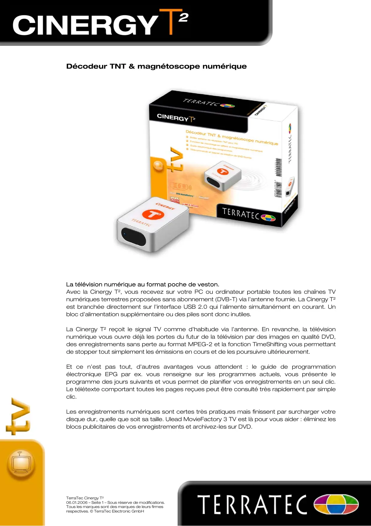 La Cinergy T² reçoit le signal TV comme d’habitude via l’antenne. En revanche, la télévision numérique vous ouvre déjà les portes du futur de la télévision par des images en qualité DVD, des enregistrements sans perte au format MPEG-2 et la fonction TimeShifting vous permettant de stopper tout simplement les émissions en cours et de les poursuivre ultérieurement. Et ce n’est pas tout, d’autres avantages vous attendent : le guide de programmation électronique EPG par ex. vous renseigne sur les programmes actuels, vous présente le programme des jours suivants et vous permet de planifier vos enregistrements en un seul clic. Le télétexte comportant toutes les pages reçues peut être consulté très rapidement par simple clic. Les enregistrements numériques sont certes très pratiques mais finissent par surcharger votre disque dur, quelle que soit sa taille. Ulead MovieFactory 3 TV est là pour vous aider : éliminez les blocs publicitaires de vos enregistrements et archivez-les sur DVD.
