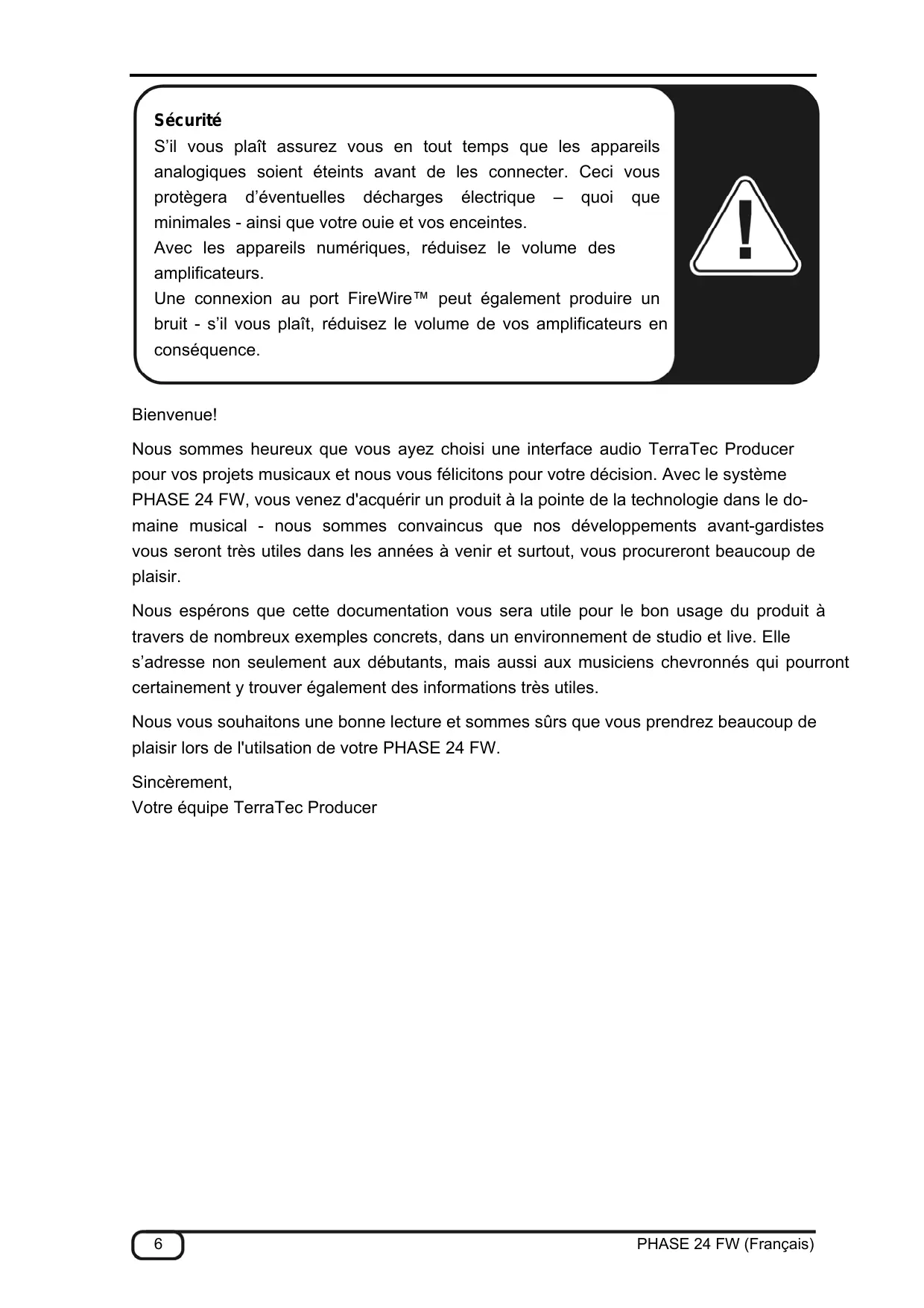- Système requis/recommandé Sécurité S’il vous plaît assurez vous en tout temps que les appareils analogiques soient éteints avant de les connecter. Ceci vous protègera d’éventuelles décharges électrique – quoi que minimales - ainsi que votre ouie et vos enceintes. Avec les appareils numériques, réduisez le volume des amplificateurs. Une connexion au port FireWire™ peut également produire un bruit - s’il vous plaît, réduisez le volume de vos amplificateurs en conséquence. Bienvenue! Nous sommes heureux que vous ayez choisi une interface audio TerraTec Producer pour vos projets musicaux et nous vous félicitons pour votre décision. Avec le système PHASE 24 FW, vous venez d'acquérir un produit à la pointe de la technologie dans le domaine musical - nous sommes convaincus que nos développements avant-gardistes vous seront très utiles dans les années à venir et surtout, vous procureront beaucoup de plaisir. Nous espérons que cette documentation vous sera utile pour le bon usage du produit à travers de nombreux exemples concrets, dans un environnement de studio et live. Elle s’adresse non seulement aux débutants, mais aussi aux musiciens chevronnés qui pourront certainement y trouver également des informations très utiles. Nous vous souhaitons une bonne lecture et sommes sûrs que vous prendrez beaucoup de plaisir lors de l'utilsation de votre PHASE 24 FW. Sincèrement, Votre équipe TerraTec Producer p. 36