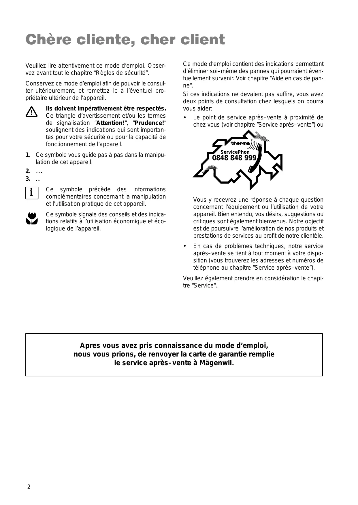 Après vous avez pris connaissance du mode d'emploi, nous vous prions de renvoyer la carte de garantie remplie au service après-vente à Mägenwil.