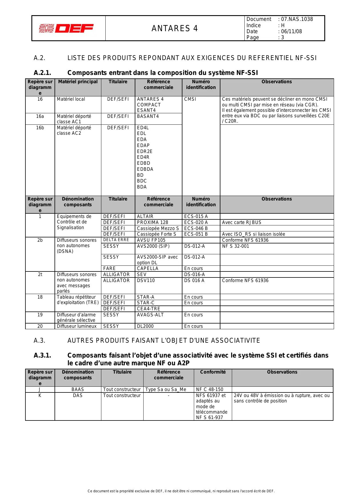 Document Indice Date Page Observations NFS 32 001 NFS 32 001 Messages parlés NFS 61 936 annexe A Flash lumineux 24V PLX2000 PLX2000-AVSPLX Série RS232 Toutes alimentations conformes NFS 61-940 Conforme NFS 61-940 Conforme NFS 61-940 3A permanent, conforme NFS 61-940 6A permanent, conforme NFS 61-940 24V ou 48V à émission ou à rupture, avec ou sans contrôle de position En PC de sécurité uniquement, pour commande de mise en sécurité ou de réarmement DANS LE CADRE DE LA MAINTENANCE ET OU D’EXTENSIONS D’INSTALLATIONS EXISTANTES Dénomination composants Equipements de Contrôle et de Signalisation Titulaire DEF/SEFI Référence commerciale NOVA VEGA Conformité Observations Ce document est la propriété exclusive de DEF, il ne doit être ni communiqué, ni reproduit sans l'accord écrit de DEF. Document Indice Date Page ANTARES 4