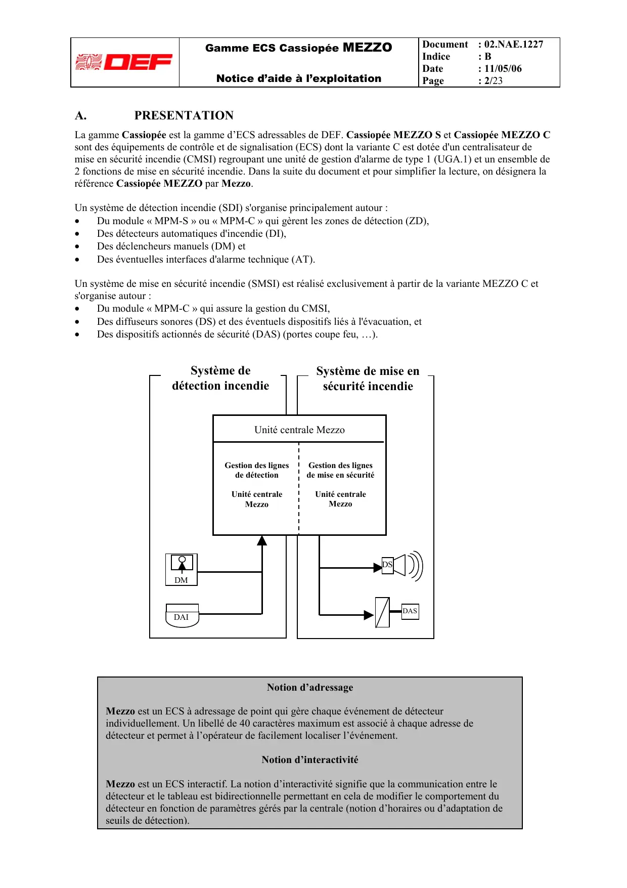 : 02.NAE.1227 : 11/05/06 : 2/23 PRESENTATION La gamme Cassiopée est la gamme d’ECS adressables de DEF. Cassiopée MEZZO S et Cassiopée MEZZO C sont des équipements de contrôle et de signalisation (ECS) dont la variante C est dotée d'un centralisateur de mise en sécurité incendie (CMSI) regroupant une unité de gestion d'alarme de type 1 (UGA.1) et un ensemble de 2 fonctions de mise en sécurité incendie. Dans la suite du document et pour simplifier la lecture, on désignera la référence Cassiopée MEZZO par Mezzo. Un système de détection incendie (SDI) s'organise principalement autour : Du module « MPM-S » ou « MPM-C » qui gèrent les zones de détection (ZD), Des détecteurs automatiques d'incendie (DI), Des déclencheurs manuels (DM) et Des éventuelles interfaces d'alarme technique (AT). Un système de mise en sécurité incendie (SMSI) est réalisé exclusivement à partir de la variante MEZZO C et s'organise autour : Du module « MPM-C » qui assure la gestion du CMSI, Des diffuseurs sonores (DS) et des éventuels dispositifs liés à l'évacuation, et Des dispositifs actionnés de sécurité (DAS) (portes coupe feu, …). Système de détection incendie Système de mise en sécurité incendie Unité centrale Mezzo Gestion des lignes de détection Gestion des lignes de mise en sécurité Unité centrale Mezzo Unité centrale Mezzo