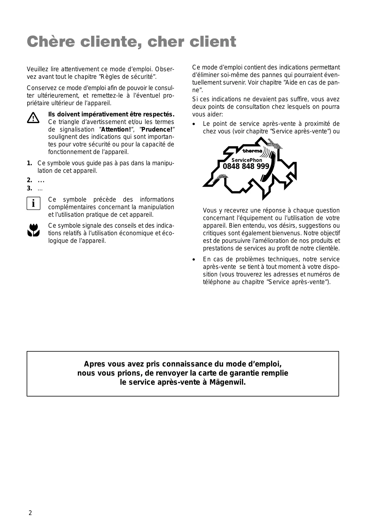 Apres vous avez pris connaissance du mode d'emploi, nous vous prions, de renvoyer la carte de garantie remplie le service après-vente à Mägenwil.