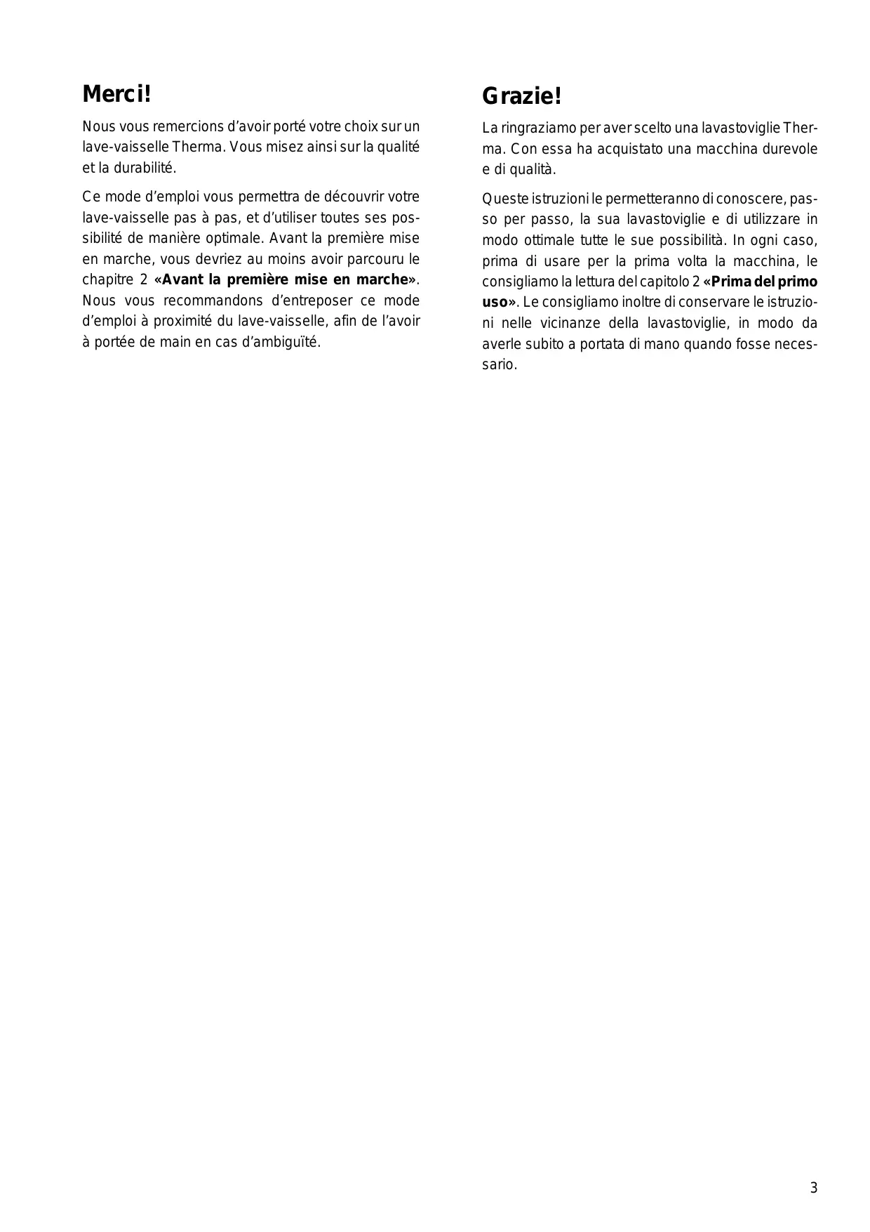 Merci! Grazie! Nous vous remercions d’avoir porté votre choix sur un lave-vaisselle Therma. Vous misez ainsi sur la qualité et la durabilité. La ringraziamo per aver scelto una lavastoviglie Therma. Con essa ha acquistato una macchina durevole e di qualità. Ce mode d’emploi vous permettra de découvrir votre lave-vaisselle pas à pas, et d’utiliser toutes ses possibilité de manière optimale. Avant la première mise en marche, vous devriez au moins avoir parcouru le