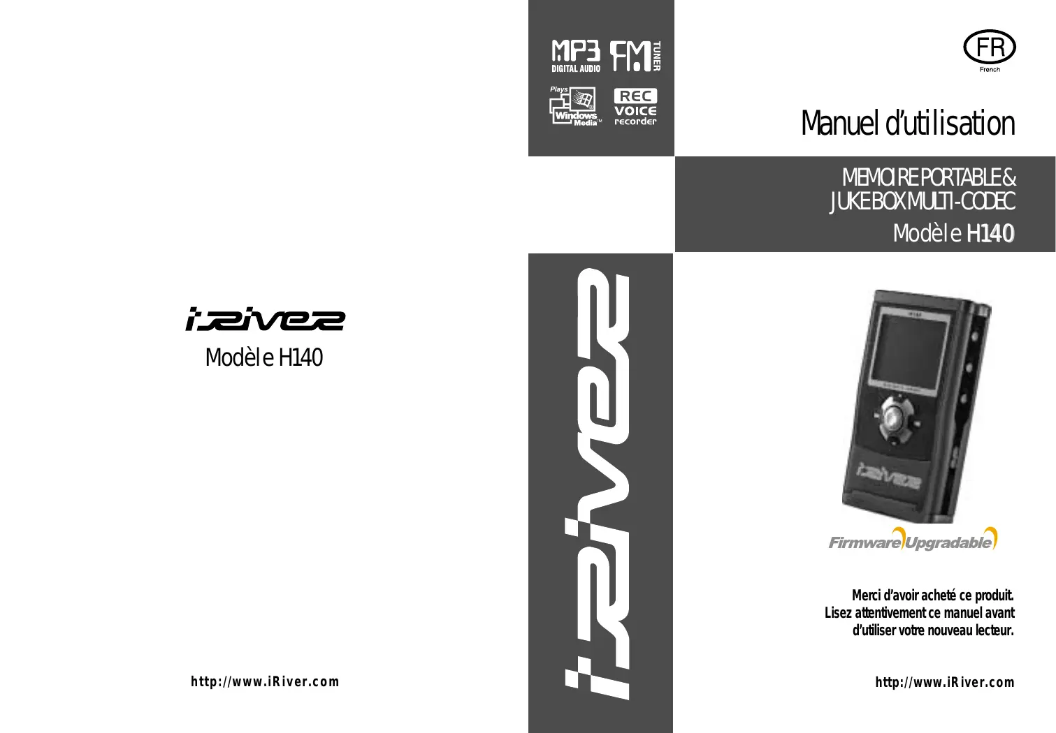 Modèle H 1 4 0 Modèle H140 Merci d’avoir acheté ce produit. Lisez attentivement ce manuel avant d’utiliser votre nouveau lecteur. http://www.iRiver.com http://www.iRiver.com CERTIFICATION FCC CET APPAREIL EST CONFORME AU PARAGRAPHE 15 DE LA REGLEMENTATION FCC. SON FONCTIONNEMENT EST SOUMIS AUX DEUX CONDITIONS SUIVANTES : (1) CET APPAREIL NE DOIT PAS PRODUIRE D'INTERFERENCES NOCIVES ET (2) CET APPAREIL DOIT ACCEPTER TOUTE INTERFERENCE RECUE, Y COMPRIS SI CETTE DERNIERE PEUT NUIRE A SON BON FONCTIONNEMENT. Remarque : Cet appareil a été testé et déclaré conforme aux exigences en matière de limitations pour un appareil numérique de classe B, aux termes du paragraphe 15 du règlement FCC. Ces limites sont destinées à assurer une protection suffisante contre les interférences néfastes dans un environnement habité. Cet appareil génère, utilise et peut émettre de l’énergie radioélectrique. S’il n'est pas installé et utilisé selon les instructions, il peut entraîner des interférences néfastes pour les communications radio. Toutefois, rien ne garantit qu’aucune interférence ne se produira dans un environnement particulier. S’il s’avère que cet appareil entraîne des interférences néfastes pour la réception de la radio ou de la télévision, ce qui peut se déterminer en éteignant puis en allumant l’appareil, nous vous recommandons d’essayer de supprimer les interférences par une ou plusieurs des mesures suivantes : - Réorientez l'antenne de réception ou changez son emplacement. - Augmentez la distance entre l'appareil et le récepteur. - Branchez l'appareil sur une prise d’un circuit différent de celui auquel le récepteur est relié. - Demandez de l'aide au revendeur ou à un technicien radio/TV expérimenté. REMARQUE : LE FABRICANT NE SAURAIT ETRE TENU RESPONSABLE DE TOUTE INTERFERENCE RADIO OU TV DUE A DES MODIFICATIONS NON AUTORISEES APPORTEES A CET APPAREIL. CES MODIFICATIONS