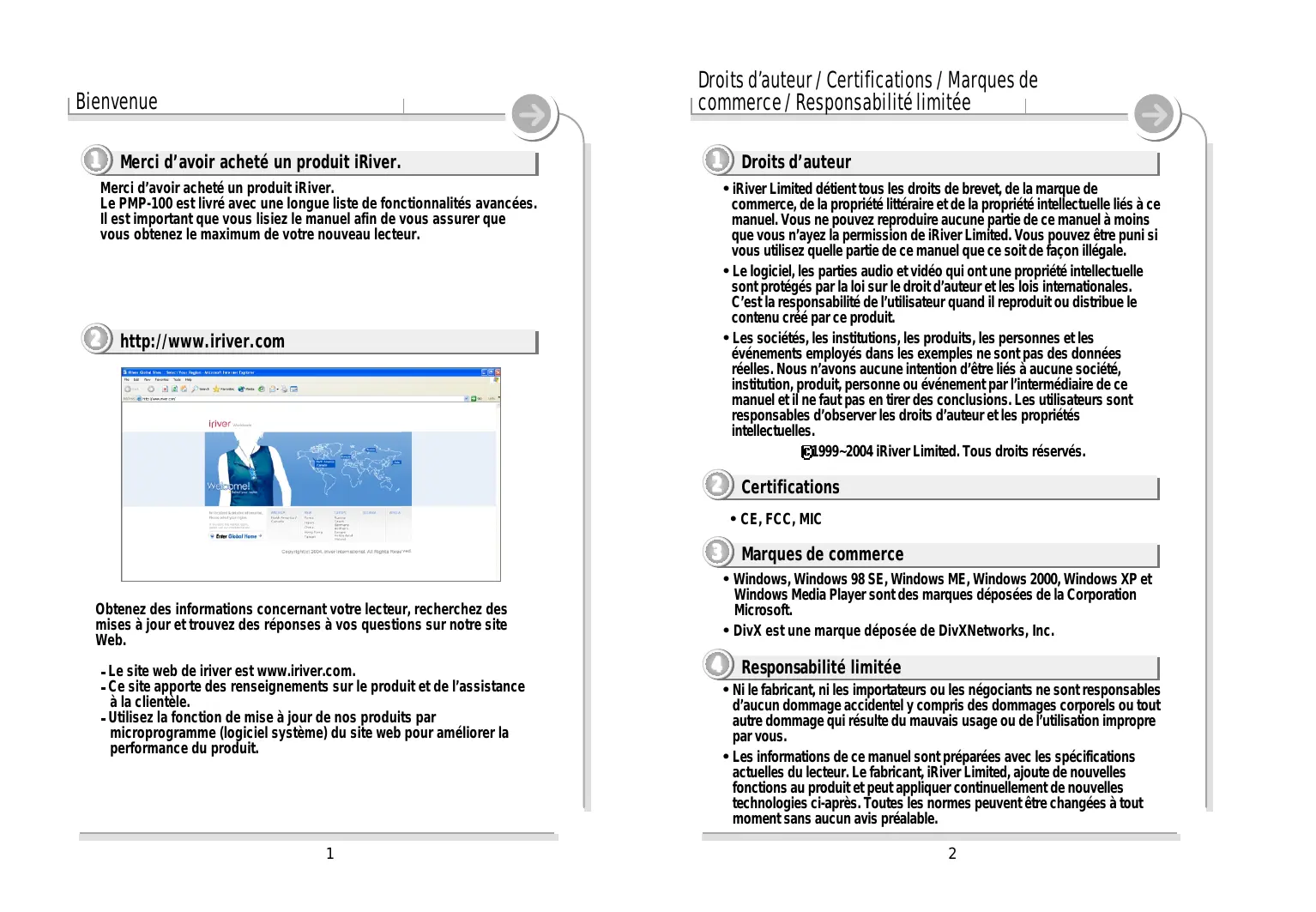 - Les informations de ce manuel sont préparées avec les specifications actuelles du lecteur. Le fabricant, iRiver Limited, ajoute de nouvelles fonctions au produit et peut appliquer continuellement de nouvelles technologies ci-après. Toutes les normes peuvent être changées à tout moment sans aucune avis préalable.