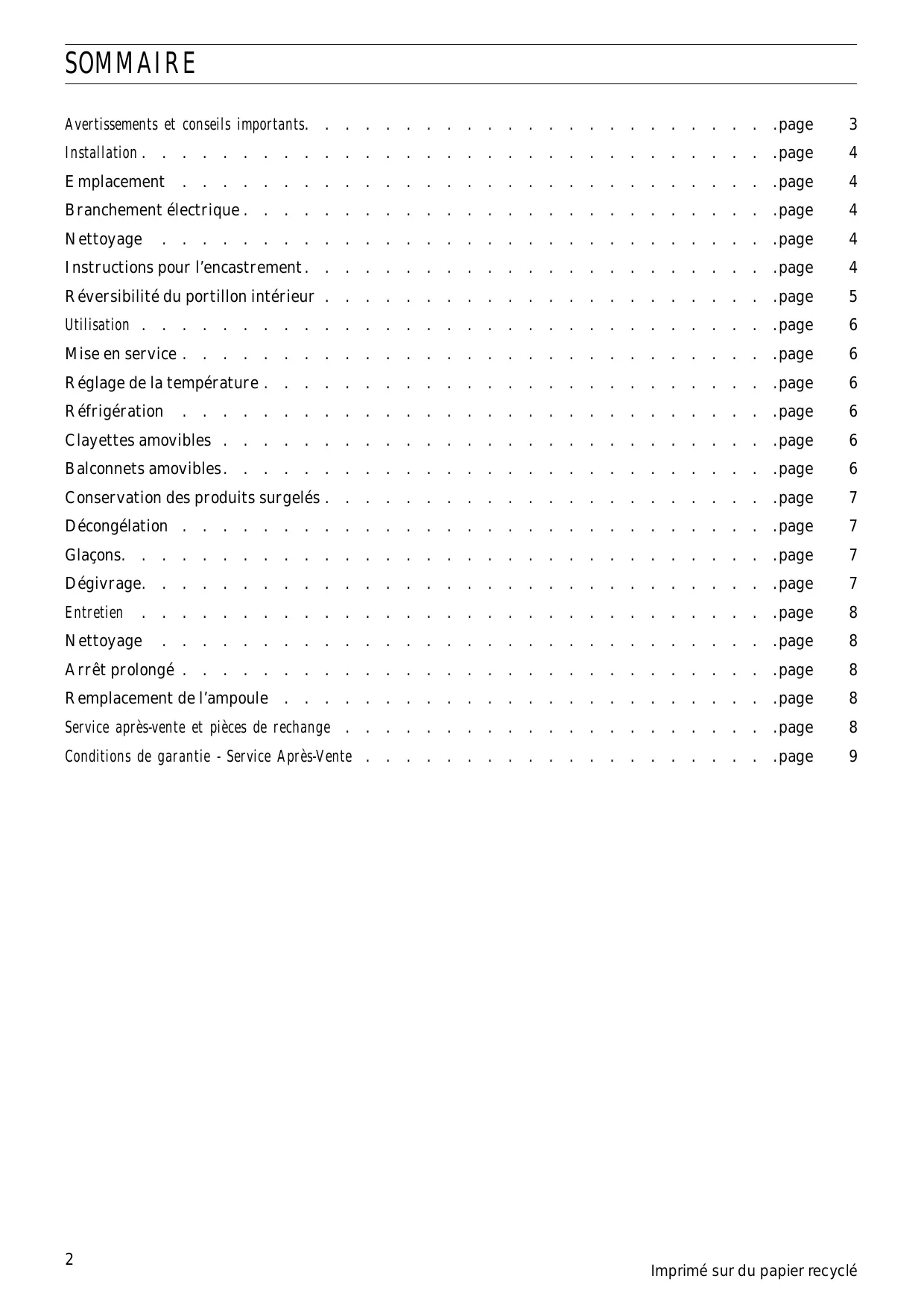SOMMAIRE Avertissements et conseils importants. Installation . E mplacement Branchement électrique. Nettoyage Instructions pour l'encastrement. Réversibilité du portillon intérieur . Utilisation . Mise en service . Réglage de la température . Réfrigération Clayettes amovibles . Balconnets amovibles. Conservation des produits surgelés . Décongélation Glaçons. Dégivrage. Entretien Nettoyage Arrêt prolongé . Remplacement de l'ampoule Service après-vente et pièces de rechange Conditions de garantie - Service Après-Vente ...page .page .page .page .page .page .page .page .page .page .page .page .page .page .page .page .page .page .page .page .page .page .page W © @@ © @@ © M M OH M 0 mn nm A UM À PR À PB À WW Imprimé sur du papier recyclé