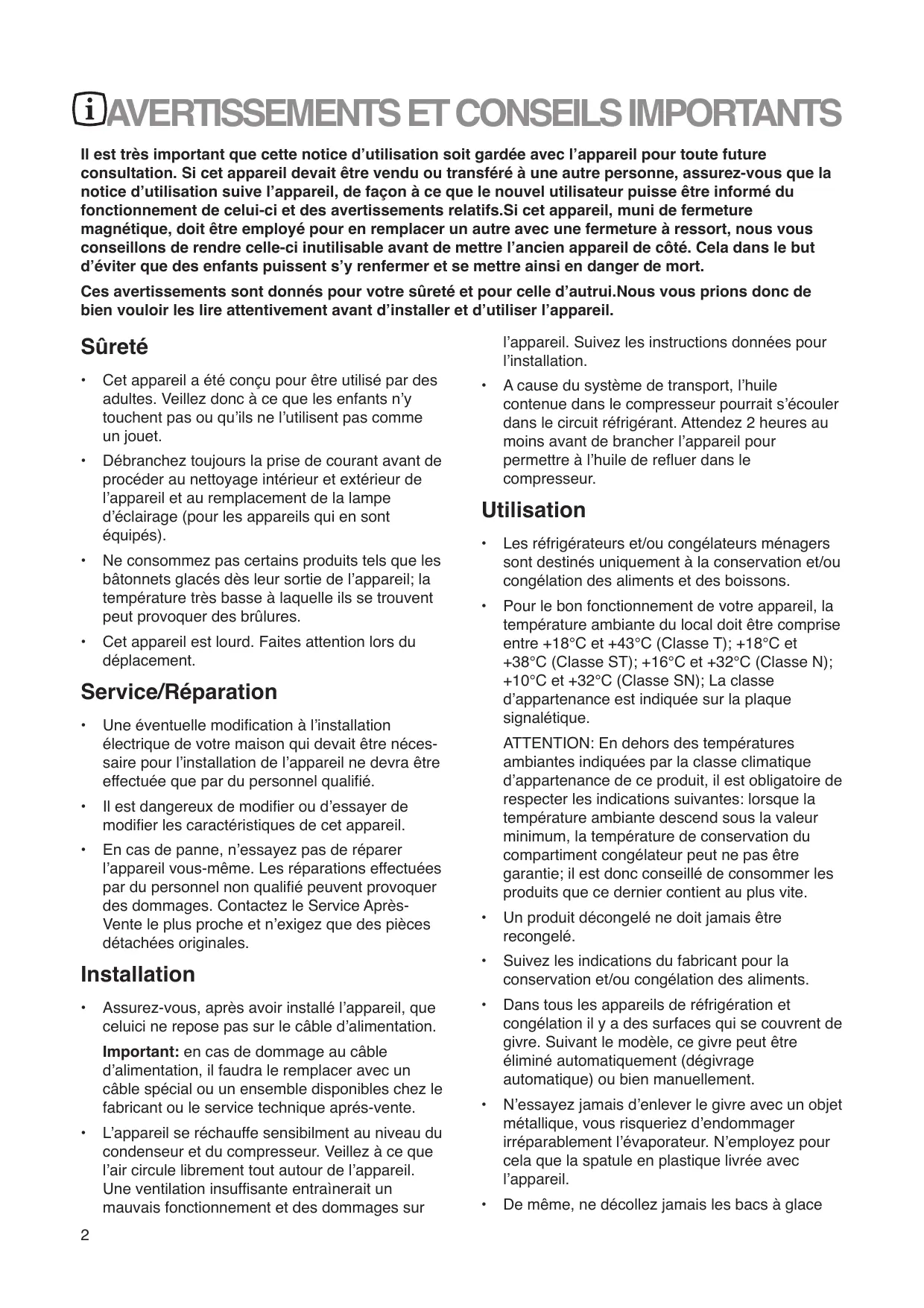 Pour le bon fonctionnement de votre appareil, la tempŽrature ambiante du local doit •tre comprise entre +18¡C et +43¡C (Classe T); +18¡C et +38¡C (Classe ST); +16¡C et +32¡C (Classe N); +10¡C et +32¡C (Classe SN); La classe dÕappartenance est indiquŽe sur la plaque signalŽtique. Cet appareil est lourd. Faites attention lors du dŽplacement. Service/RŽparation