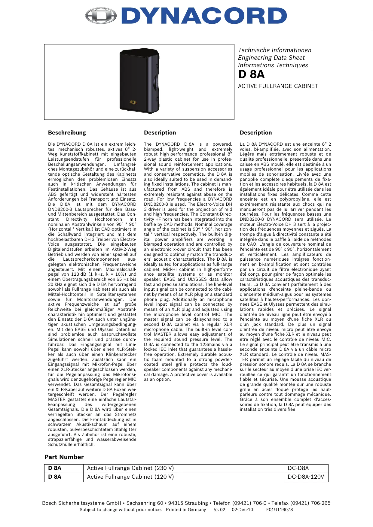 Retrouvez gratuitement la notice de l'appareil D 8A DYNACORD au format PDF.