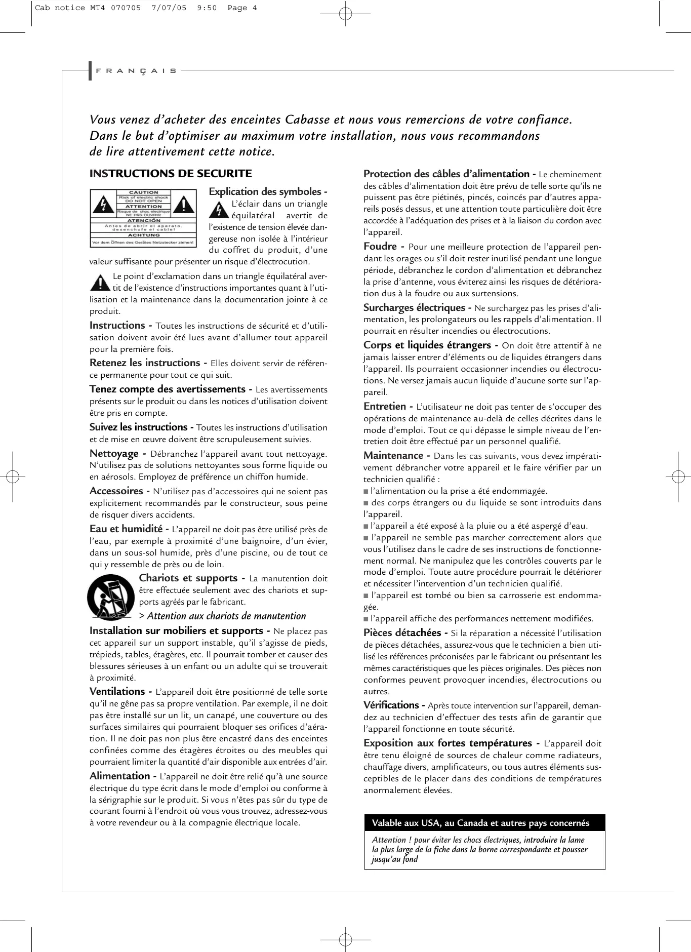 Les ébénisteries de la gamme MT4, réalisées avec un revêtement spécifique enduit de deux vernis de protection et d'une pellicule anti-rayures, ne nécessitant aucun entretien particulier, le matériel应用é étant un produit de très haute technicité. Elles peuvent être nettoyées avec un chiffon humide. En suivant les conseils d'installation, de branchement et d'emploi explicés dans cette notice, vous étés assurés d'un fonctionnement parfait de vos enceintes acoustiques. Nous reçèvons tous les jours deslettres de clients satisfaits du choix de leurs enceintes et ceslettres sont pour nous la plus belle récompense de nos efforts.