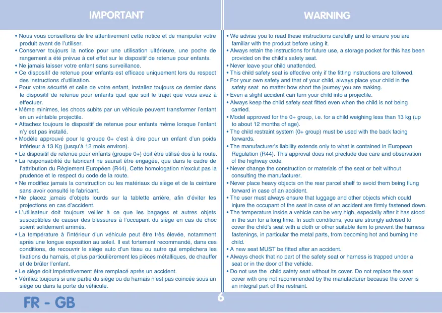 •N ous vous conseillons de lire attentivement cette notice et de manipuler votre produit avant de l’utiliser. • Conserver toujours la notice pour une utilisation ultérieure, une poche de rangement a été prévue à cet effet sur le dispositif de retenue pour enfants. • Ne jamais laisser votre enfant sans surveillance. • Ce dispositif de retenue pour enfants est efficace uniquement lors du respect des instructions d’utilisation. • Pour votre sécurité et celle de votre enfant, installez toujours ce dernier dans le dispositif de retenue pour enfants quel que soit le trajet que vous avez à effectuer. • Même minimes, les chocs subits par un véhicule peuvent transformer l’enfant en un véritable projectile. • Attachez toujours le dispositif de retenue pour enfants même lorsque l’enfant n’y est pas installé. • Modèle approuvé pour le groupe 0+ c’est à dire pour un enfant d’un poids inférieur à 13 Kg (jusqu’à 12 mois environ). • Le dispositif de retenue pour enfants (groupe 0+) doit être utilisé dos à la route. •L a responsabilité du fabricant ne saurait être engagée, que dans le cadre de l’attribution du Règlement Européen (R44). Cette homologation n’exclut pas la prudence et le respect du code de la route. • Ne modifiez jamais la construction ou les matériaux du siège et de la ceinture sans avoir consulté le fabricant. • Ne placez jamais d’objets lourds sur la tablette arrière, afin d’éviter les projections en cas d’accident. • L’utilisateur doit toujours veiller à ce que les bagages et autres objets susceptibles de causer des blessures à l’occupant du siège en cas de choc soient solidement arrimés. • La température à l’intérieur d’un véhicule peut être très élevée, notamment après une longue exposition au soleil. Il est fortement recommandé, dans ces conditions, de recouvrir le siège auto d’un tissu ou autre qui empêchera les fixations du harnais, et plus particulièrement les pièces métalliques, de chauffer et de brûler l’enfant. • Le siège doit impérativement être remplacé après un accident. • Vérifiez toujours si une partie du siège ou du harnais n’est pas coincée sous un siège ou dans la porte du véhicule.