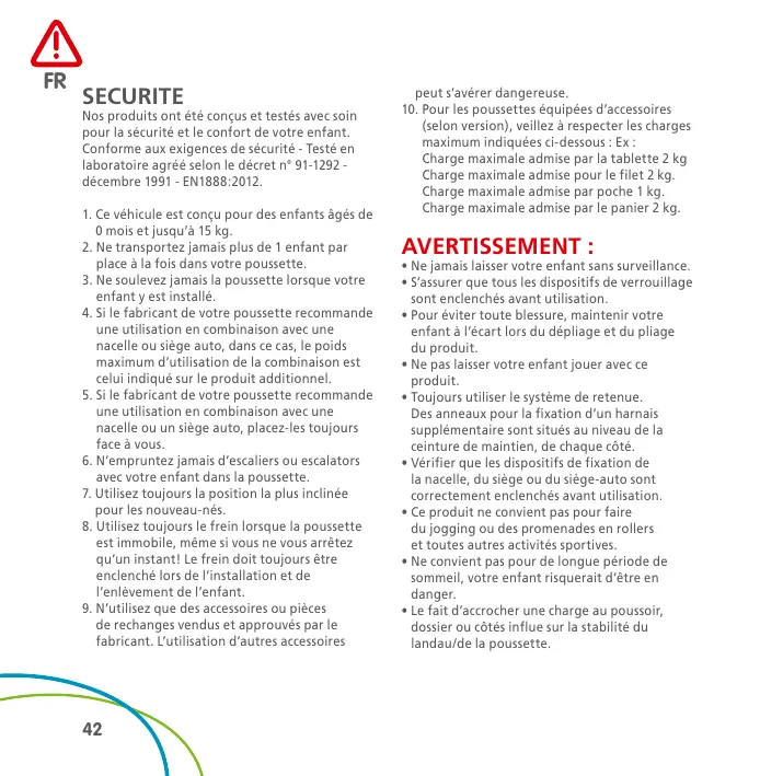 Conforme aux exigences de sécurité - Testé en laboratoire agréé selon le décret n° 91-1292 décembre 1991 - EN1888:2012. 1. C e véhicule est conçu pour des enfants âgés de 0 mois et jusqu’à 15 kg. 2. N e transportez jamais plus de 1 enfant par place à la fois dans votre poussette. 3. Ne soulevez jamais la poussette lorsque votre enfant y est installé. 4. S i le fabricant de votre poussette recommande une utilisation en combinaison avec une nacelle ou siège auto, dans ce cas, le poids maximum d’utilisation de la combinaison est celui indiqué sur le produit additionnel. 5. S i le fabricant de votre poussette recommande une utilisation en combinaison avec une nacelle ou un siège auto, placez-les toujours face à vous. 6. N ’empruntez jamais d’escaliers ou escalators avec votre enfant dans la poussette. 7. U tilisez toujours la position la plus inclinée pour les nouveau-nés. 8. Utilisez toujours le frein lorsque la poussette est immobile, même si vous ne vous arrêtez qu’un instant! Le frein doit toujours être enclenché lors de l’installation et de l’enlèvement de l’enfant. 9. N ’utilisez que des accessoires ou pièces de rechanges vendus et approuvés par le fabricant. L’utilisation d’autres accessoires