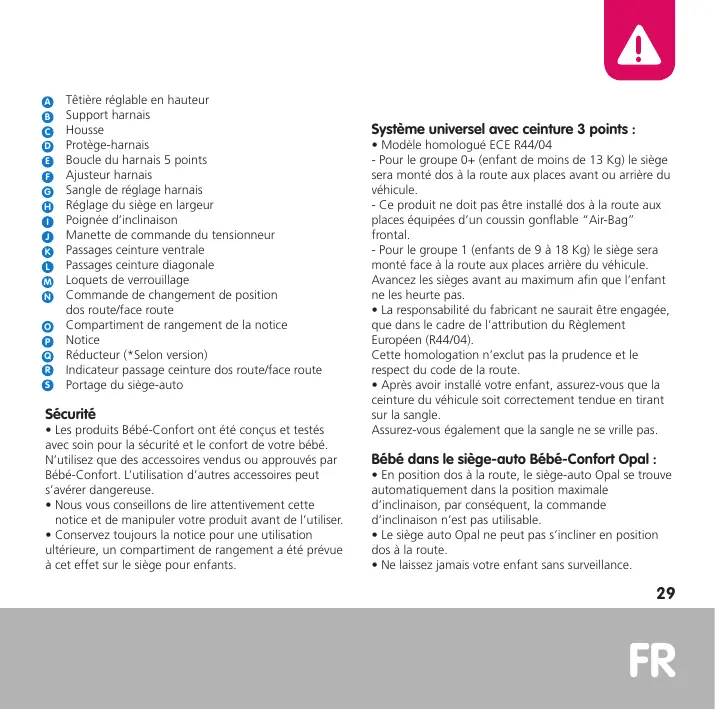 • Ce dispositif est seulement utilisable sur les véhicules approuvés équipés de ceintures de sécurité 3 points / statiques / à enrouleur, homologuées, conformément au règlement CEE N°16 / ONU ou d’une norme équivalente. • En position dos à la route (GR0+), ce produit ne doit pas être installé aux places équipées d’un coussin gonflable “Air-Bag” frontal. Vous avez peut-être la possibilité de le désactiver (voir notice fournie avec votre véhicule). Dans ce cas, si vous pouvez désactiver l’airbag, vous pouvez l’utiliser à l’avant de votre véhicule. • En position face à la route (GR1), le siège doit être placé sur la banquette arrière du véhicule ou exceptionnellement à l’avant selon la législation en