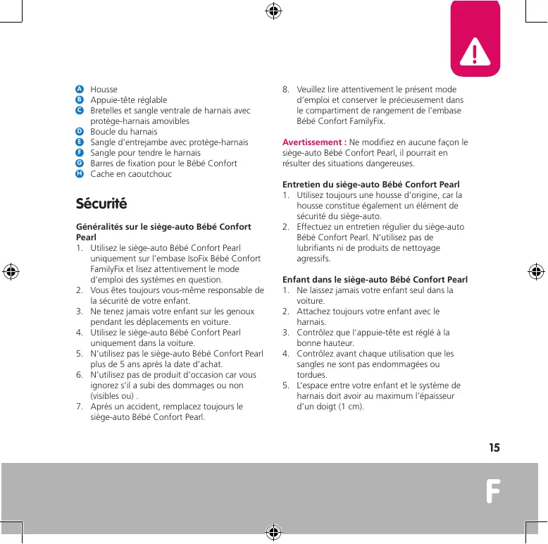8. V euillez lire attentivement le présent mode d’emploi et conserver le précieusement dans le compartiment de rangement de l’embase Bébé Confort FamilyFix. Avertissement : Ne modifiez en aucune façon le siège-auto Bébé Confort Pearl, il pourrait en résulter des situations dangereuses. Entretien du siège-auto Bébé Confort Pearl 1. Utilisez toujours une housse d’origine, car la housse constitue également un élément de sécurité du siège-auto. 2. Effectuez un entretien régulier du siège-auto Bébé Confort Pearl. N’utilisez pas de lubrifiants ni de produits de nettoyage agressifs. Enfant dans le siège-auto Bébé Confort Pearl 1. Ne laissez jamais votre enfant seul dans la voiture. 2. Attachez toujours votre enfant avec le harnais. 3. Contrôlez que l’appuie-tête est réglé à la bonne hauteur. 4. Contrôlez avant chaque utilisation que les sangles ne sont pas endommagées ou tordues. 5. L’espace entre votre enfant et le système de harnais doit avoir au maximum l’épaisseur d’un doigt (1 cm).