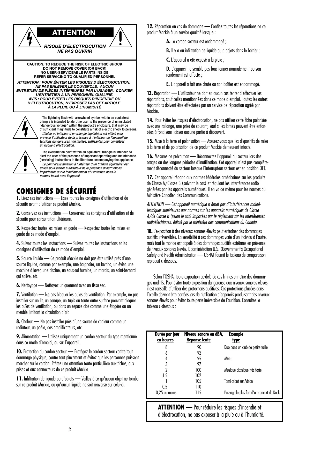 - Réparation — L'utilisateur ne doit enaucun cas tenter d'effectuer les réparations, sauf celles mentionnées dans ce mode d'emploi. Toutes les autres réparations doivent être effectuées par un service de réparation agrée par Mackie.