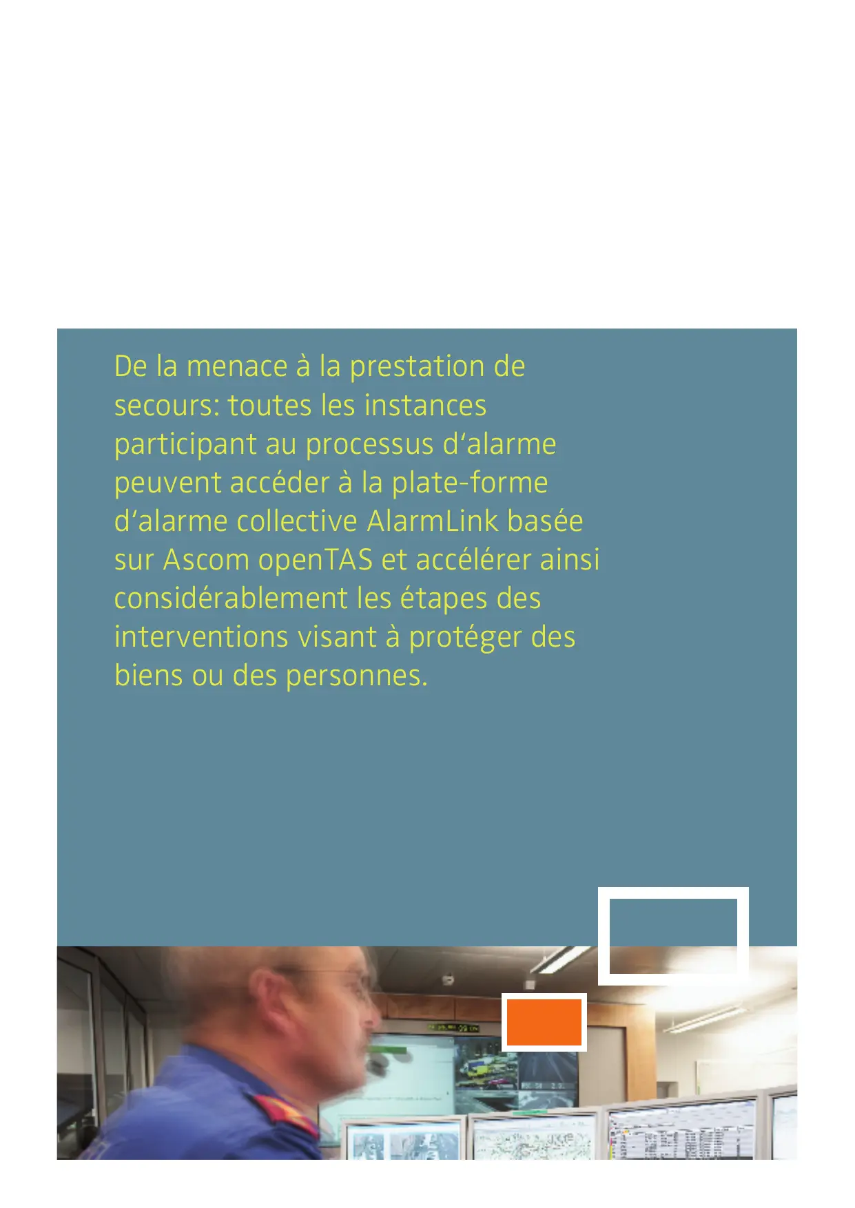 De la menace à la prestation de secours: toutes les instances participant au processus d‘alarme peuvent accéder à la plate-forme d‘alarme collective AlarmLink basée sur Ascom openTAS et accélérer ainsi considérablement les étapes des interventions visant à protéger des biens ou des personnes.
