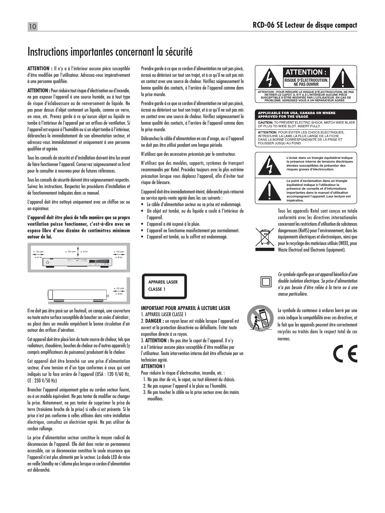Instructions importantes concernant la sécurité ATTENTION : Il n’y a à l’intérieur aucune pièce susceptible d’être modifiée par l’utilisateur. Adressez-vous impérativement à une personne qualifiée. ATTENTION : Pour réduire tout risque d’électrisation ou d’incendie, ne pas exposer l’appareil à une source humide, ou à tout type de risque d’éclaboussure ou de renversement de liquide. Ne pas poser dessus d’objet contenant un liquide, comme un verre, un vase, etc. Prenez garde à ce qu’aucun objet ou liquide ne tombe à l’intérieur de l’appareil par ses orifices de ventilation. Si l’appareil est exposé à l’humidité ou si un objet tombe à l’intérieur, débranchez-le immédiatement de son alimentation secteur, et adressez-vous immédiatement et uniquement à une personne qualifiée et agréée. Tous les conseils de sécurité et d’installation doivent être lus avant de faire fonctionner l’appareil. Conservez soigneusement ce livret pour le consulter à nouveau pour de futures références. Tous les conseils de sécurité doivent être soigneusement respectés. Suivez les instructions. Respectez les procédures d’installation et de fonctionnement indiquées dans ce manuel. L’appareil doit être nettoyé uniquement avec un chiffon sec ou un aspirateur. L’appareil doit être placé de telle manière que sa propre ventilation puisse fonctionner, c’est-à-dire avec un espace libre d’une dizaine de centimètres minimum autour de lui. Prendre garde à ce que ce cordon d’alimentation ne soit pas pincé, écrasé ou détérioré sur tout son trajet, et à ce qu’il ne soit pas mis en contact avec une source de chaleur. Vérifiez soigneusement la bonne qualité des contacts, à l’arrière de l’appareil comme dans la prise murale. Prendre garde à ce que ce cordon d’alimentation ne soit pas pincé, écrasé ou détérioré sur tout son trajet, et à ce qu’il ne soit pas mis en contact avec une source de chaleur. Vérifiez soigneusement la bonne qualité des contacts, à l’arrière de l’appareil comme dans la prise murale. N’utilisez que des accessoires préconisés par le constructeur. N’utilisez que des meubles, supports, systèmes de transport recommandés par Rotel. Procédez toujours avec la plus extrême précaution lorsque vous déplacez l’appareil, afin d’éviter tout risque de blessure. L’appareil doit être immédiatement éteint, débranché puis retourné au service après-vente agréé dans les cas suivants :
