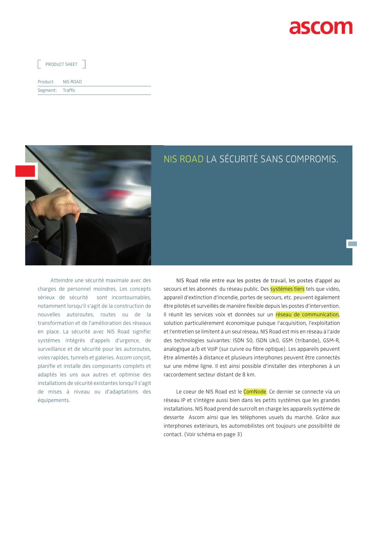 PRODUCT SHEET Product: NIS ROAD Segment: Traffic NIS ROAD LA SÉCURITÉ SANS COMPROMIS. Atteindre une sécurité maximale avec des charges de personnel moindres. Les concepts sérieux de sécurité sont incontournables, notamment lorsqu‘il s‘agit de la construction de nouvelles autoroutes, routes ou de la transformation et de l’amélioration des réseaux en place. La sécurité avec NIS Road signifie: systèmes intégrés d‘appels d‘urgence, de surveillance et de sécurité pour les autoroutes, voies rapides, tunnels et galeries. Ascom conçoit, planifie et installe des composants complets et adaptés les uns aux autres et optimise des installations de sécurité existantes lorsqu‘il s‘agit de mises à niveau ou d‘adaptations des équipements. NIS Road relie entre eux les postes de travail, les postes d’appel au secours et les abonnés du réseau public. Des systèmes tiers tels que vidéo, appareil d‘extinction d‘incendie, portes de secours, etc. peuvent également être pilotés et surveillés de manière flexible depuis les postes d’intervention. Il réunit les services voix et données sur un réseau de communication, solution particulièrement économique puisque l‘acquisition, l’exploitation et l‘entretien se limitent à un seul réseau. NIS Road est mis en réseau à l‘aide des technologies suivantes: ISDN S0, ISDN Uk0, GSM (tribande), GSM-R, analogique a/b et VoIP (sur cuivre ou fibre optique). Les appareils peuvent être alimentés à distance et plusieurs interphones peuvent être connectés sur une même ligne. Il est ainsi possible d‘installer des interphones à un raccordement secteur distant de 8 km. Le coeur de NIS Road est le ComNode. Ce dernier se connecte via un réseau IP et s‘intègre aussi bien dans les petits systèmes que les grandes installations. NIS Road prend de surcroît en charge les appareils système de desserte Ascom ainsi que les téléphones usuels du marché. Grâce aux interphones extérieurs, les automobilistes ont toujours une possibilité de contact. (Voir schéma en page 3)