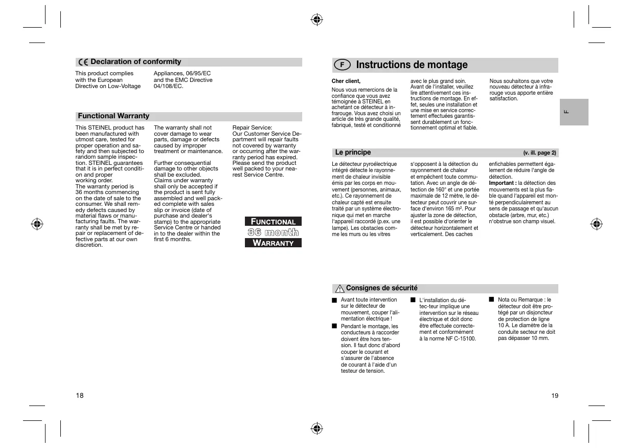 OBSSCE et à directe Service après-vente et garantie Ce produit STEINEL a été La garanti ne s'applique ni fabriqué avec le pus aux pièces d'usure, naux Son, Son fonciomiment et dommages et éfaLs us à Sa sécurité ot té contrée une utliation ou maine-nan- Suvant des procédures la” co incomectes. bles ea 8l soumis à un gone fnalpar sondage. Les dommages consécuis STEEL garant un état et causés à d'autres objet sont un fonctionnement imépr EXC dela garant, La durée de garanti est de La garantiene s'applique que Sms ct dfbue aupu de appel no does la vente au consommateur. retourné au point de service Nous remécions aux défauts apres veniee ps proche, provenant d'un vice de ma. dans un embalage adéqua. Fe ou de consructen Lage- accompagné d'u lciie ou ranbe era assurée à noie d'un che de casse porant Garon parréparaion ou [a date d'achai etie cache du échange des pièces défec- vendeur ou s'i est remis lues Au vendeur das les 8 pre rer mo de La garanti. ds
