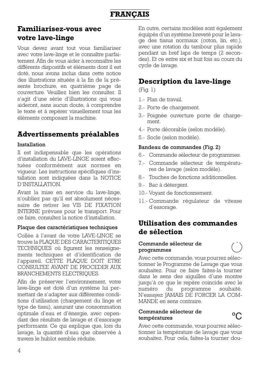 En outre, certains modéles sont également équipés d’un systéme breveté pour le lavage des tissus normaux (coton, lin, etc.), avec une rotation du tambour plus rapide pendant un bref laps de temps (2 secondes). Et ce entre six et huit fois au cours du cycle de lavage. Description du lave-linge (Fig. 1) 1.- Plan de travail. 2.- Porte de chargement. 3.- Poignée ouverture porte de chargement. 4.- Porte décorable (selon modèle). 5.- Socle (selon modèle). Bandeau de commandes (Fig. 2) 6.- Commande sélecteur de programmes. 7.- Commande sélecteur de températures de lavage (selon modèle). 8.- Touches de fonctions additionnelles. 9.- Bac à détergent. 10.- Voyant de fonctionnement. 11.- Commande régulateur de vitesse d’essorage. Utilisation des commandes de sélection Commande sélecteur de programmes Avec cette commande, vous pourrez sélectionner le Programme de Lavage que vous souhaitez. Pour ce faire faites-la tourner dans le sens des aiguilles d’une montre jusqu’à ce que le repère coincide avec le numéro programme souhaité. N’essayez JAMAIS DE FORCER LA COMMANDE en sens contraire. Commande sélecteur de températures Avec cette commande, vous pourrez sélectionner la température de lavage que vous souhaitez. Pour cela, faites-la tourner dou-