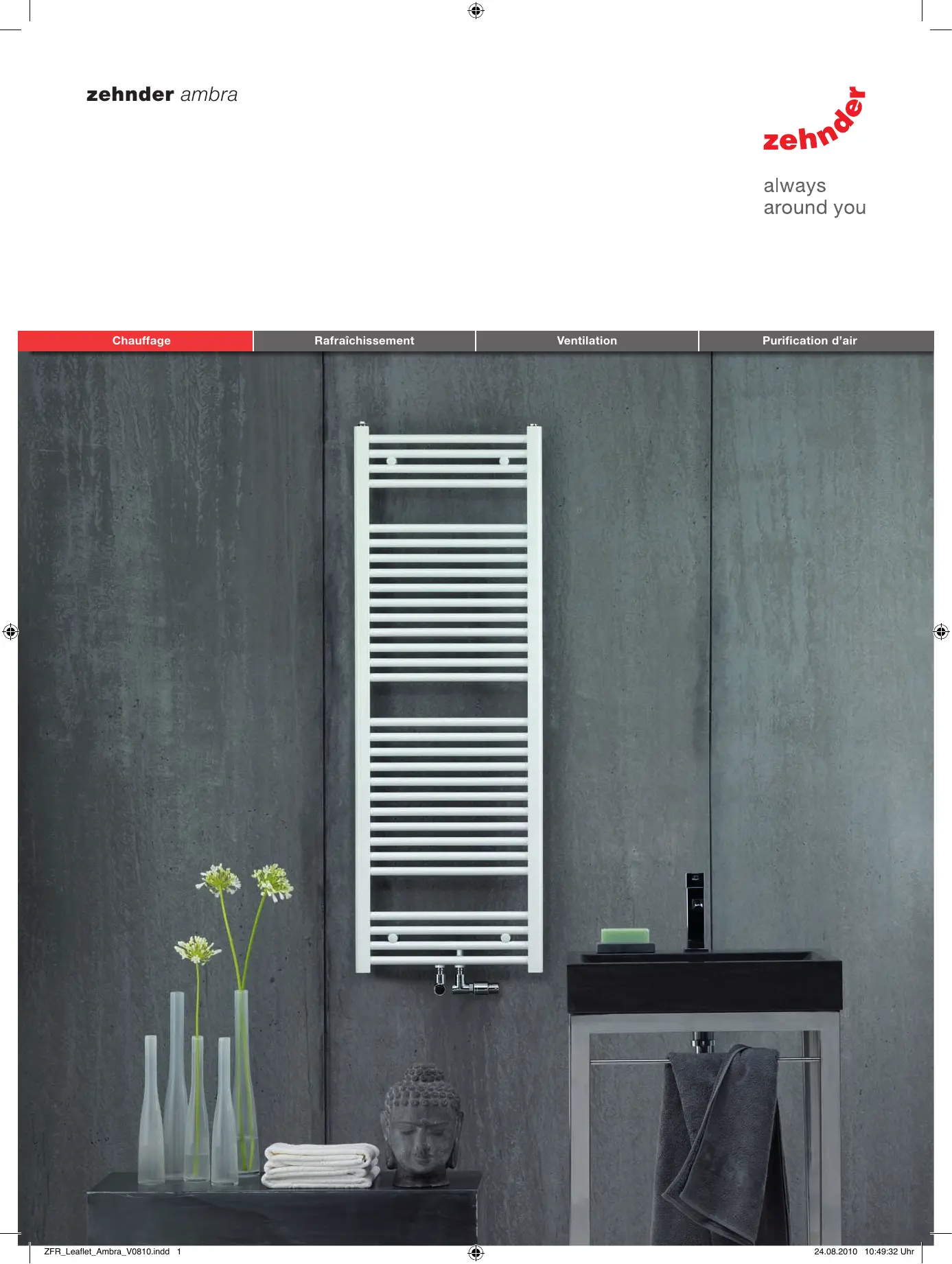 Modèle 120 Modèle 150 Modèle 180 Modèle droit Description du produit Le radiateur sèche-serviettes Zehnder Ambra de style moderne offre un excellent rapport qualité / prix. Les tubes horizontaux de ce modèle peuvent être droits ou cintrés. En plus des orifices en bout des collecteurs, ce radiateur dispose aussi d’un entraxe 50 mm au centre de l’appareil permettant de prévoir les tuyauteries à l’avance. Modèle 80 Modèle 120 Modèle 150 Modèle 180 Modèle cintré Données techniques Matériau Pression de service Raccords ½ Température de service Modèle droit eau chaude ou mixte (Résistance DBM livrée non montée à commander séparément) Modèles max 120° EN 442 Hauteur Largeur Poids Entraxe Puissance Δt 50K