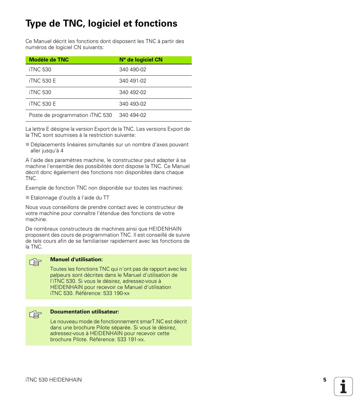 smarT.NC: Sélectionner le premier champ dans le cadre précédent/suivant Type de TNC, logiciel et fonctions Ce Manuel décrit les fonctions dont disposent les TNC à partir des numéros de logiciel CN suivants: Modèle de TNC N° de logiciel CN iTNC 530 340 490-02 iTNC 530 E 340 491-02 iTNC 530 340 492-02 iTNC 530 E 340 493-02 Poste de programmation iTNC 530 340 494-02 La lettre E désigne la version Export de la TNC. Les versions Export de la TNC sont soumises à la restriction suivante: Déplacements linéaires simultanés sur un nombre d'axes pouvant aller jusqu'à 4 A l'aide des paramètres machine, le constructeur peut adapter à sa machine l'ensemble des possibilités dont dispose la TNC. Ce Manuel décrit donc également des fonctions non disponibles dans chaque TNC. Exemple de fonction TNC non disponible sur toutes les machines: Etalonnage d'outils à l'aide du TT Nous vous conseillons de prendre contact avec le constructeur de votre machine pour connaître l'étendue des fonctions de votre machine. De nombreux constructeurs de machines ainsi que HEIDENHAIN proposent des cours de programmation TNC. Il est conseillé de suivre de tels cours afin de se familiariser rapidement avec les fonctions de la TNC. Manuel d'utilisation: Toutes les fonctions TNC qui n'ont pas de rapport avec les palpeurs sont décrites dans le Manuel d'utilisation de l'iTNC 530. Si vous le désirez, adressez-vous à HEIDENHAIN pour recevoir ce Manuel d'utilisation iTNC 530. Référence: 533 190-xx Documentation utilisateur: Le nouveau mode de fonctionnement smarT.NC est décrit dans une brochure Pilote séparée. Si vous le désirez, adressez-vous à HEIDENHAIN pour recevoir cette brochure Pilote. Référence: 533 191-xx. iTNC 530 HEIDENHAIN