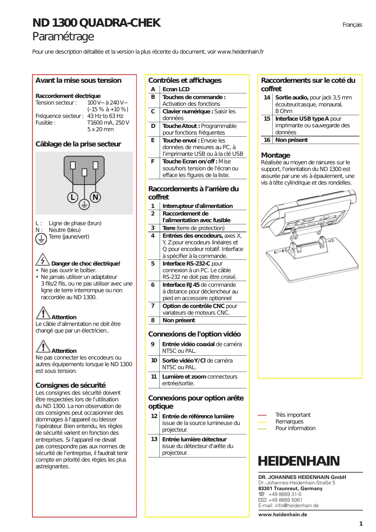 ND 1300 QUADRA-CHEK Paramétrage Français Pour une description détaillée et la version la plus récente du document, voir www.heidenhain.fr Avant la mise sous tension Raccordement électrique Tension secteur : 100 V~ à 240 V~ (–15 % à +10 %) Fréquence secteur : 43 Hz to 63 Hz Fusible : T1600 mA, 250 V 5 x 20 mm Câblage de la prise secteur Contrôles et affichages