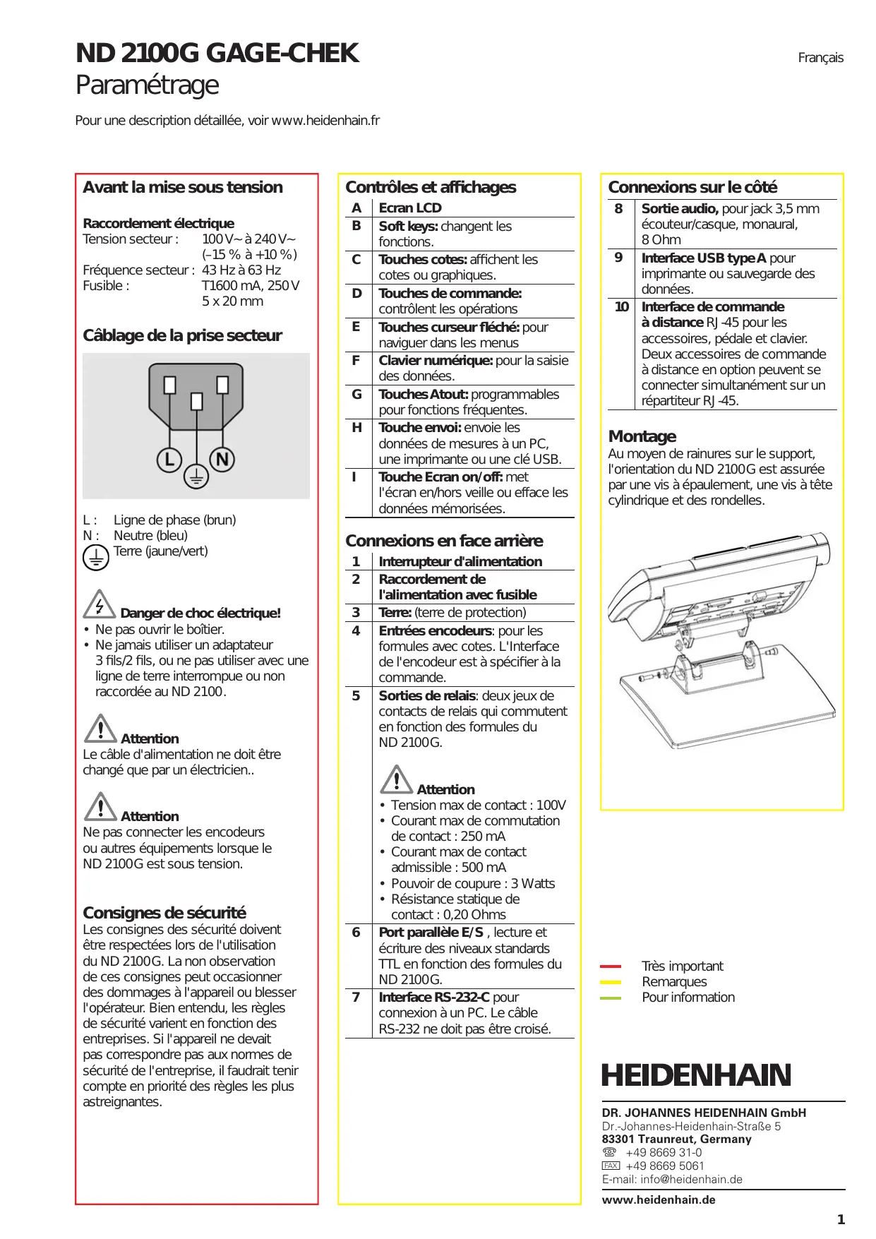 Paramétrage Français Pour une description détaillée, voir www.heidenhain.fr Avant la mise sous tension Raccordement électrique Tension secteur : 100 V~ à 240 V~ (–15 % à +10 %) Fréquence secteur : 43 Hz à 63 Hz Fusible : T1600 mA, 250 V 5 x 20 mm Câblage de la prise secteur Contrôles et affichages