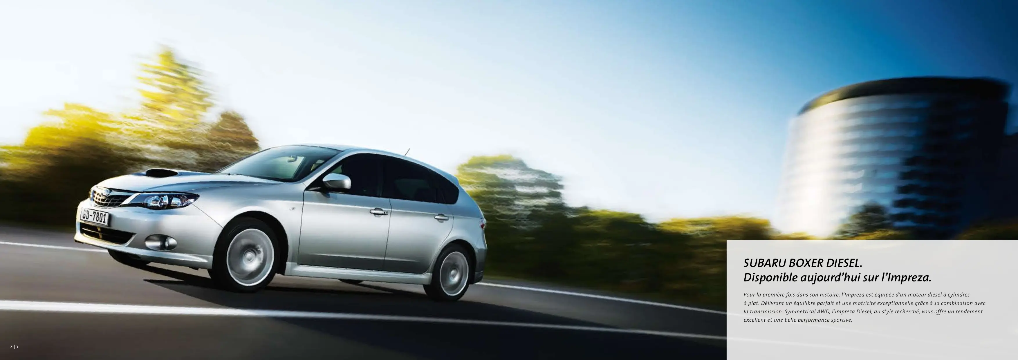 subaru-global.com www.subaru.fr IMPREZA 2.0D FUJI HEAVY INDUSTRIES LTD. Printed in The Netherlands (09GDFRFR-01) SUBARU BOXER DIESEL. Disponible aujourd’hui sur l’Impreza. Pour la première fois dans son histoire, l’Impreza est équipée d’un moteur diesel à cylindres à plat. Délivrant un équilibre parfait et une motricité exceptionnelle grâce à sa combinaison avec la transmission Symmetrical AWD, l’Impreza Diesel, au style recherché, vous offre un rendement excellent et une belle performance sportive.